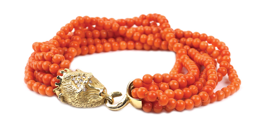 BRACCIALE COMPOSTO DA OTTO FILI DI CORALLO ROSSO anni 50/60 con chiusura a foggia di babbuino in oro giallo 18kt e diamanti taglio brillante per 0,15 punti circa, lunghezza cm. 22 peso 57,9 gr.