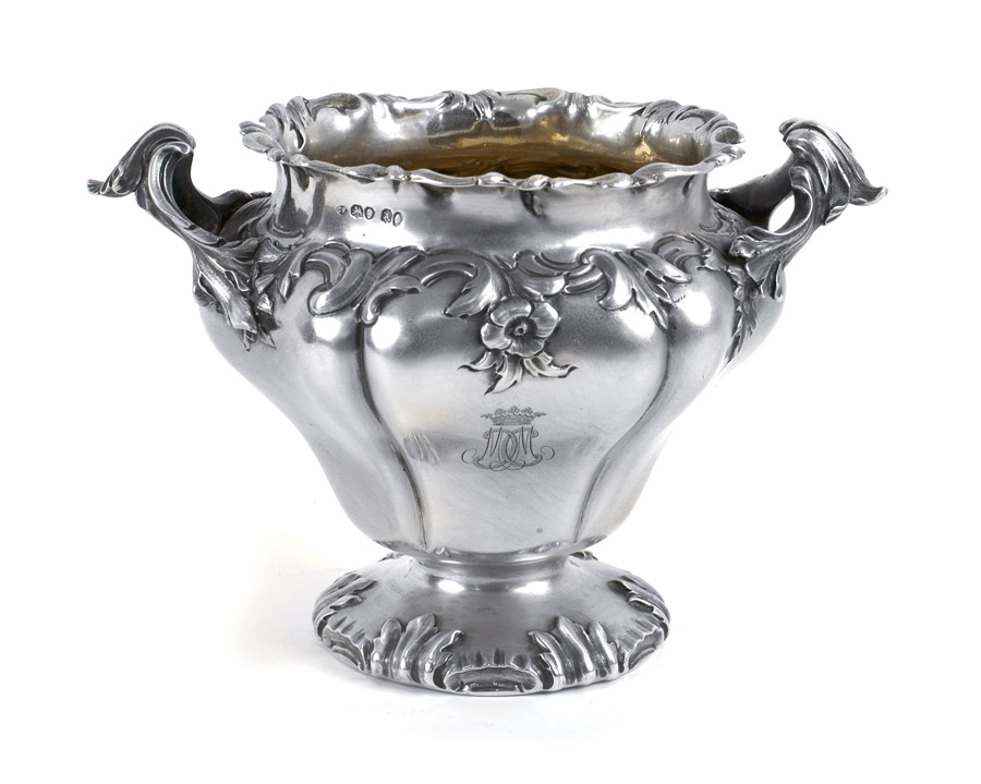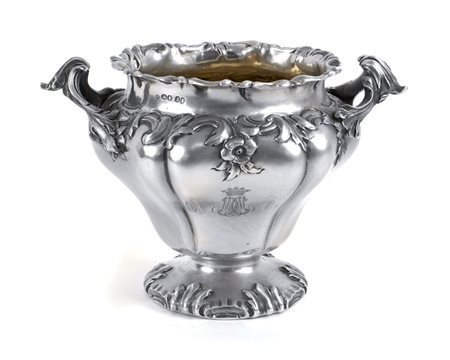ZUCCHERIERA IN ARGENTO Londra, Guglielmo IV, 1836 sbalzata e decorata a motivi floreali, manici a voluta, base circolare, h. 12,5 peso 450 gr.