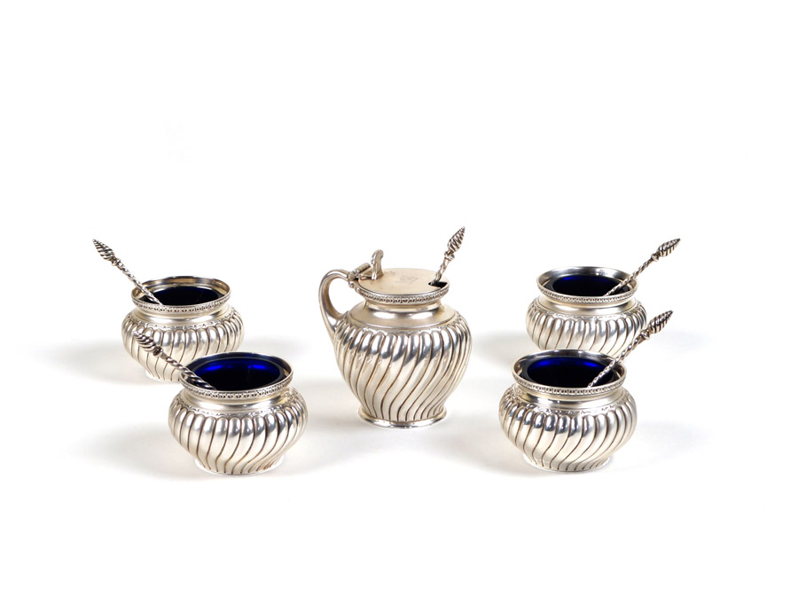 SET DI QUATTRO SALIERINE E UNA MOSTARDIERA IN ARGENTO Londra, Regina...