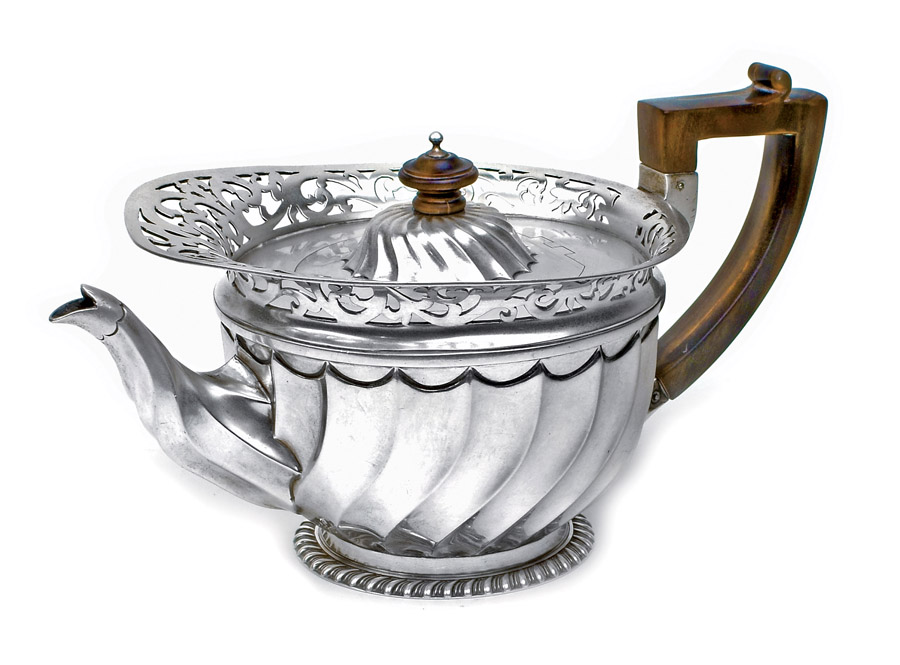 TEIERA IN ARGENTO Londra, Regina Vittoria, 1899 sezione circolare, corpo godronato con profilo traforato, manico e presa del coperchio in legno, cm. 15x28 peso 929 gr.