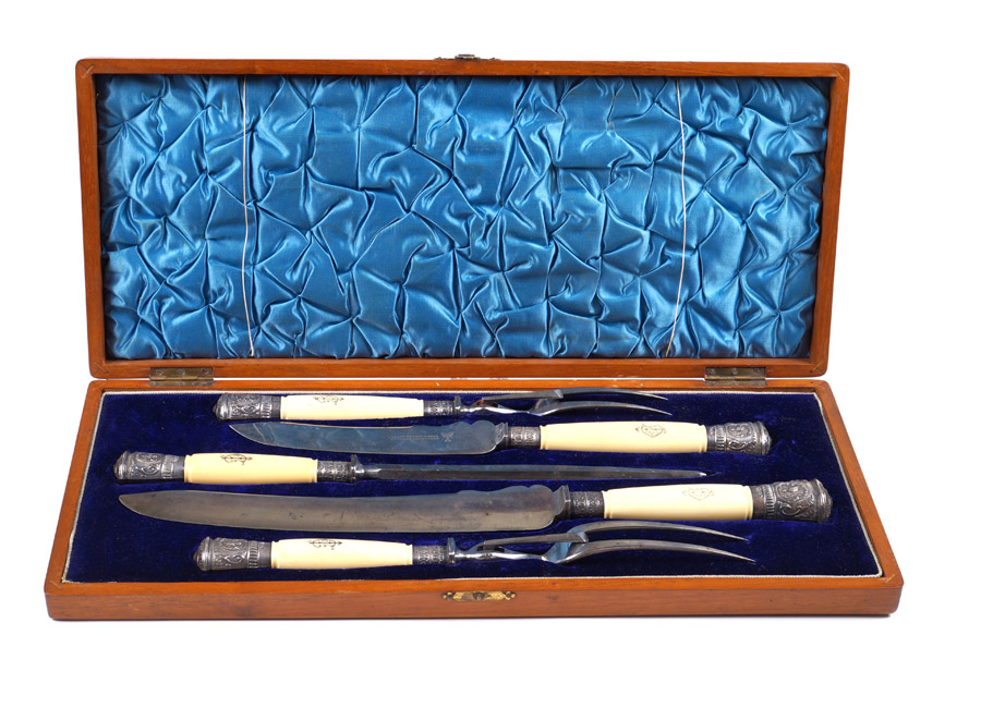 SET DI CINQUE POSATE DA PORTATA PER ARROSTO città di Sheffield, 1860 manici in avorio con monogramma inciso ed argento sbalzato, lame in metallo, entro astuccio originale in legno