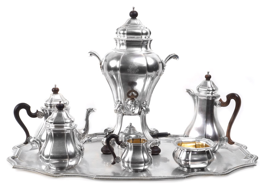 IMPORTANTE SERVIZIO THÈ E CAFFÈ IN ARGENTO Parigi, 1920 circa stile Regence composto da: 1 caffettiera, 1 teiera, 1 lattiera, 1 zuccheriera con coperchio e 1 piccola bowl per dolci, 1 samovar in metallo con scaldino e 1 vassoio in metallo, orafo argentiere Andrè Aucoc peso 2691 gr.