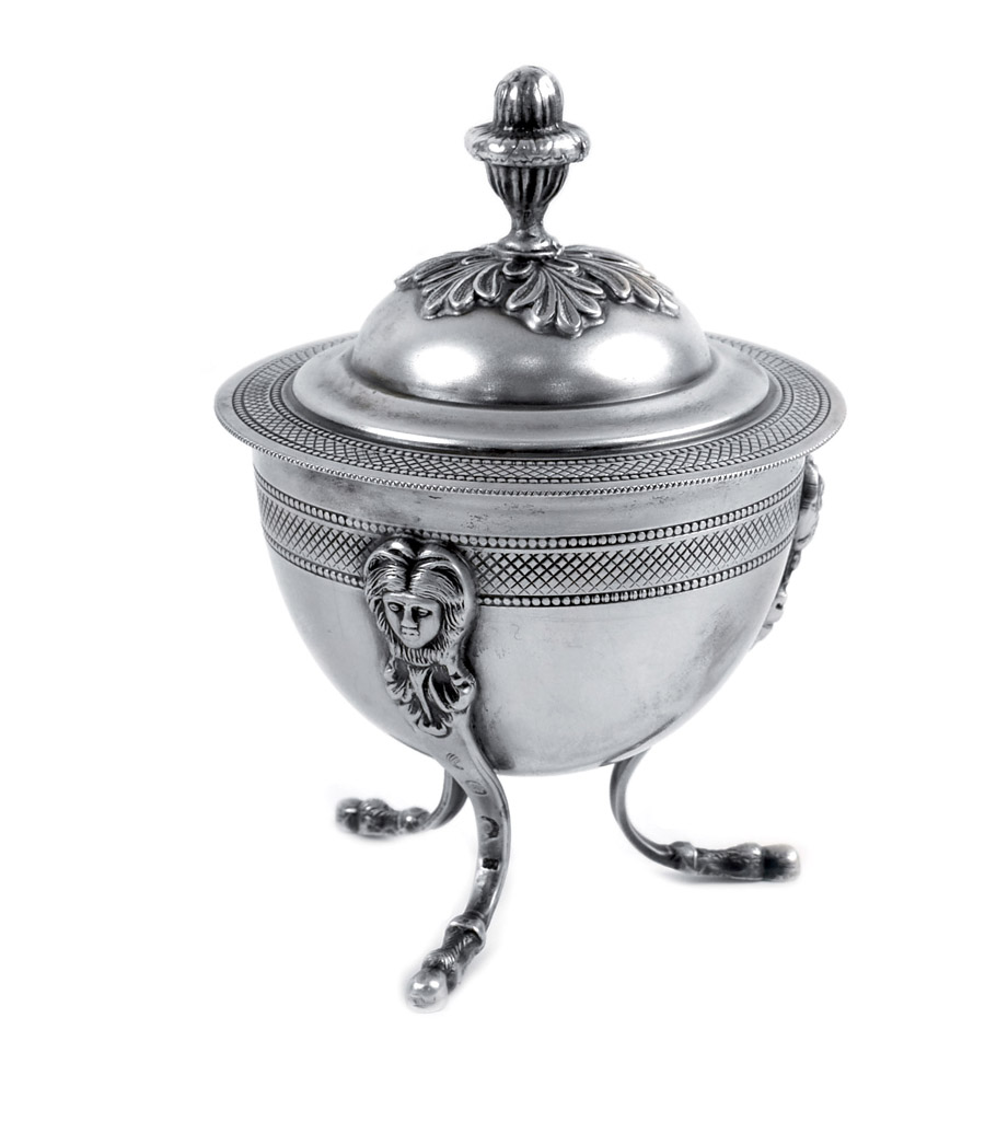 ZUCCHERIERA IN ARGENTO Venezia, XIX Sec. corpo inciso a motivi geometrici e sbalzato a motivi floreali, poggiante su piedini a tripode, h. cm. 12 peso 180 gr.