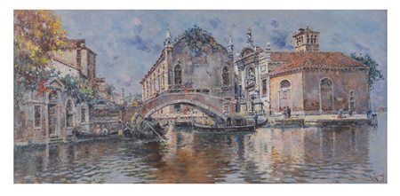 ANTONIO MARIA DE REYNA MANESCAU Malaga 1859 - Roma 1937 "Venezia, Abbazia della Misericordia", olio su tela, firmato in basso a destra, entro cornice 35,5x75,5 cm.