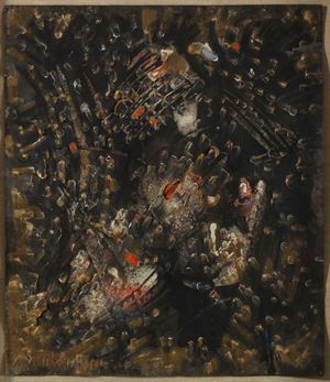 MASTROIANNI UMBERTO Fontana Liri 1910-1998 Marino Cratere lunare 1954 Cartone bucato e colorato 38x33 cm Firma in basso a sinistra Autentica del Prof. Floriano De Santi su fotografia Opera archiviata con nu. L./15/D./08 Cardboard and colored laundry Signed lower left