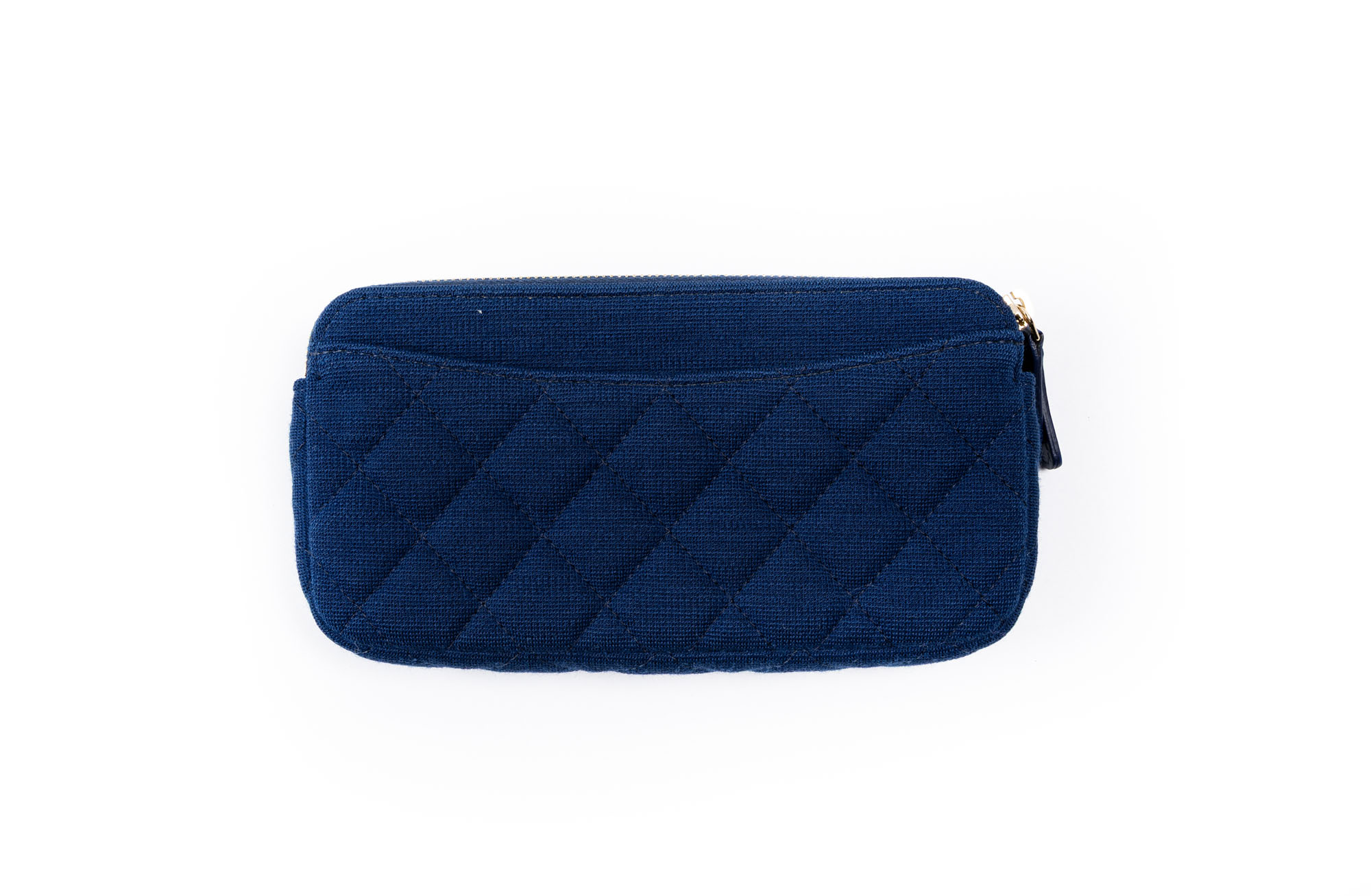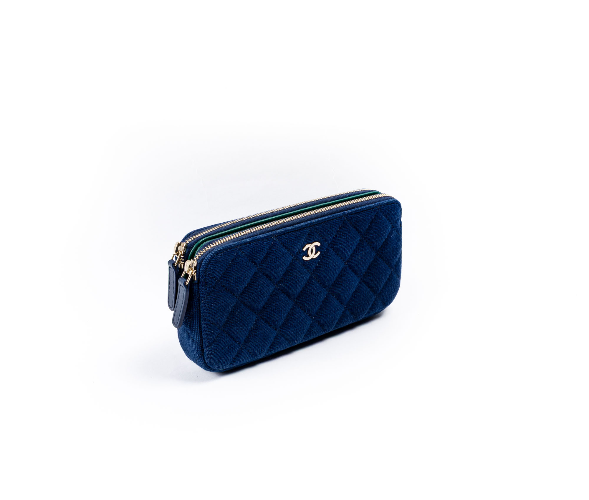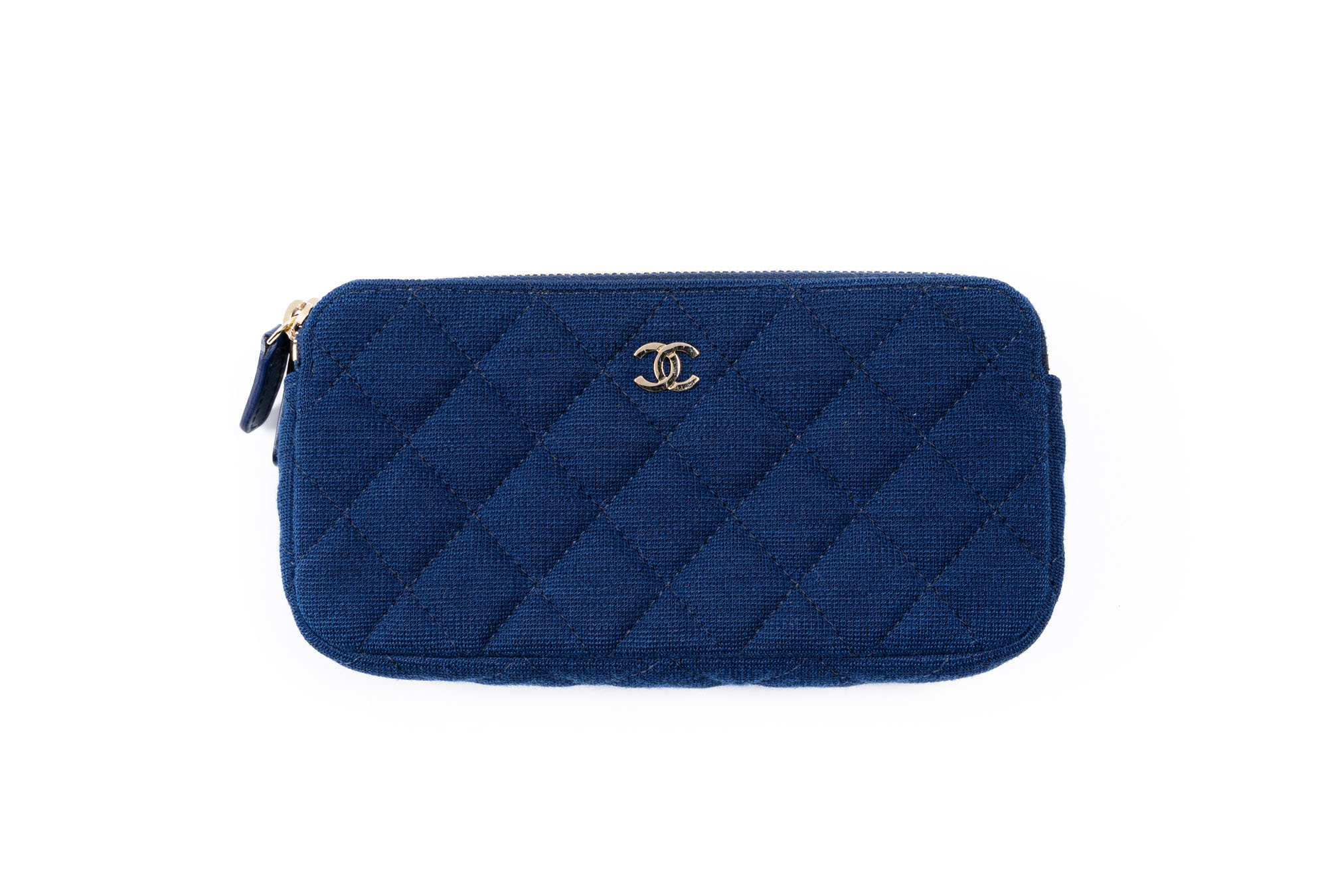 In blu matelassé jersey, pelle e dettagli in metallo dorato