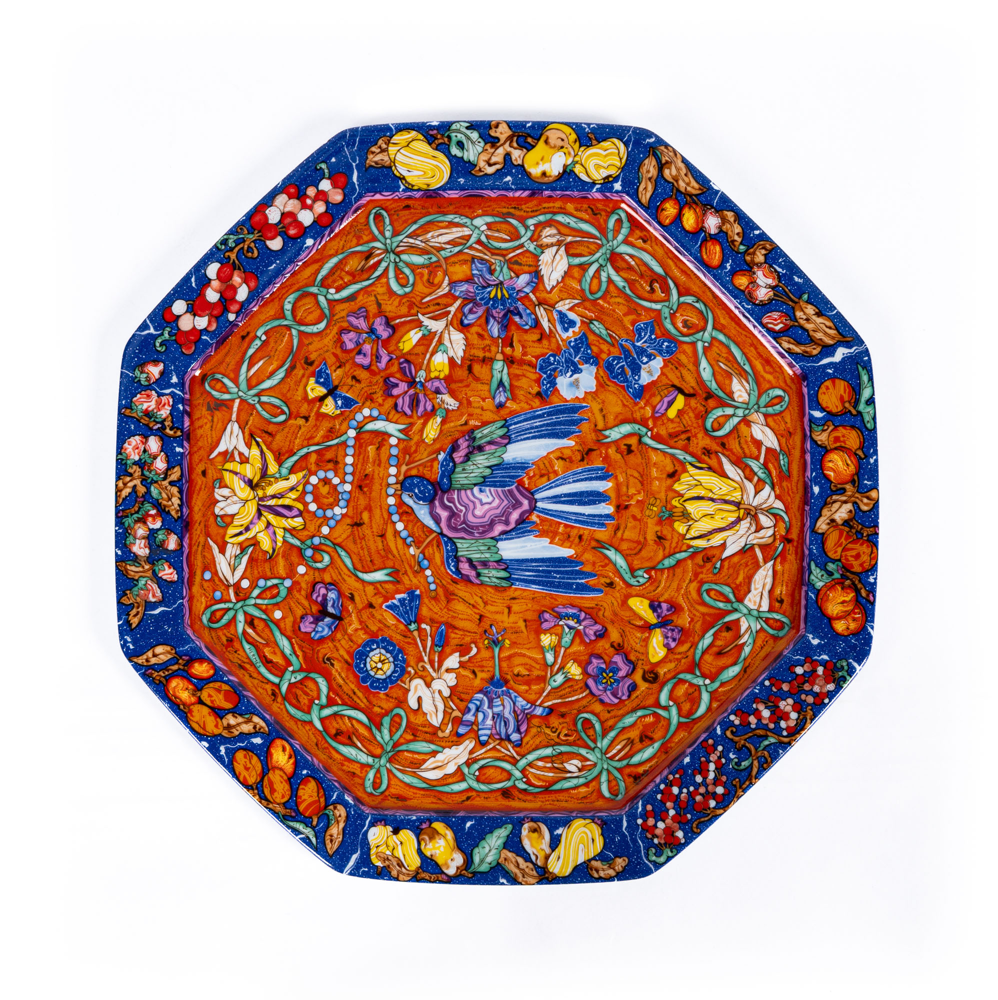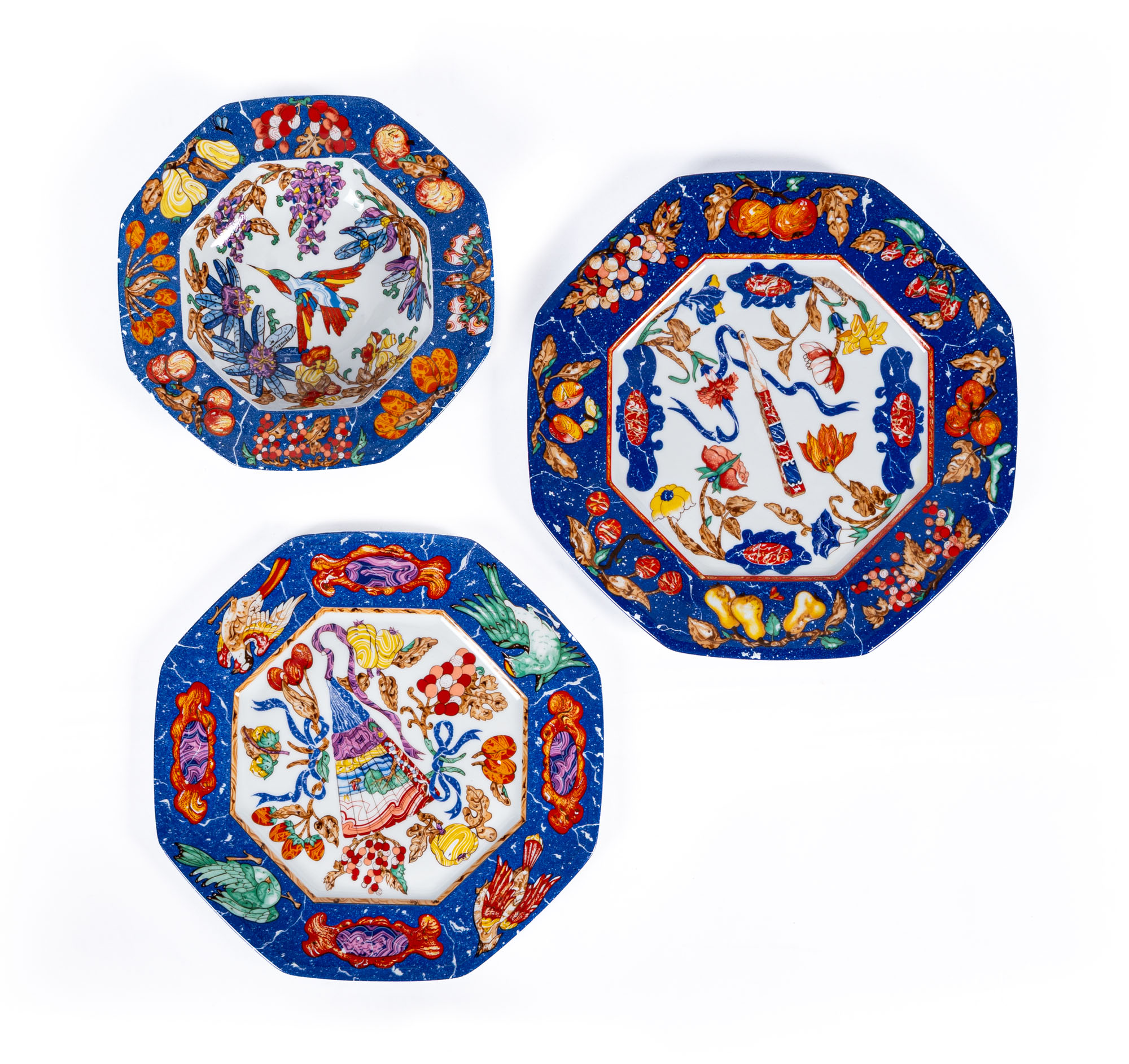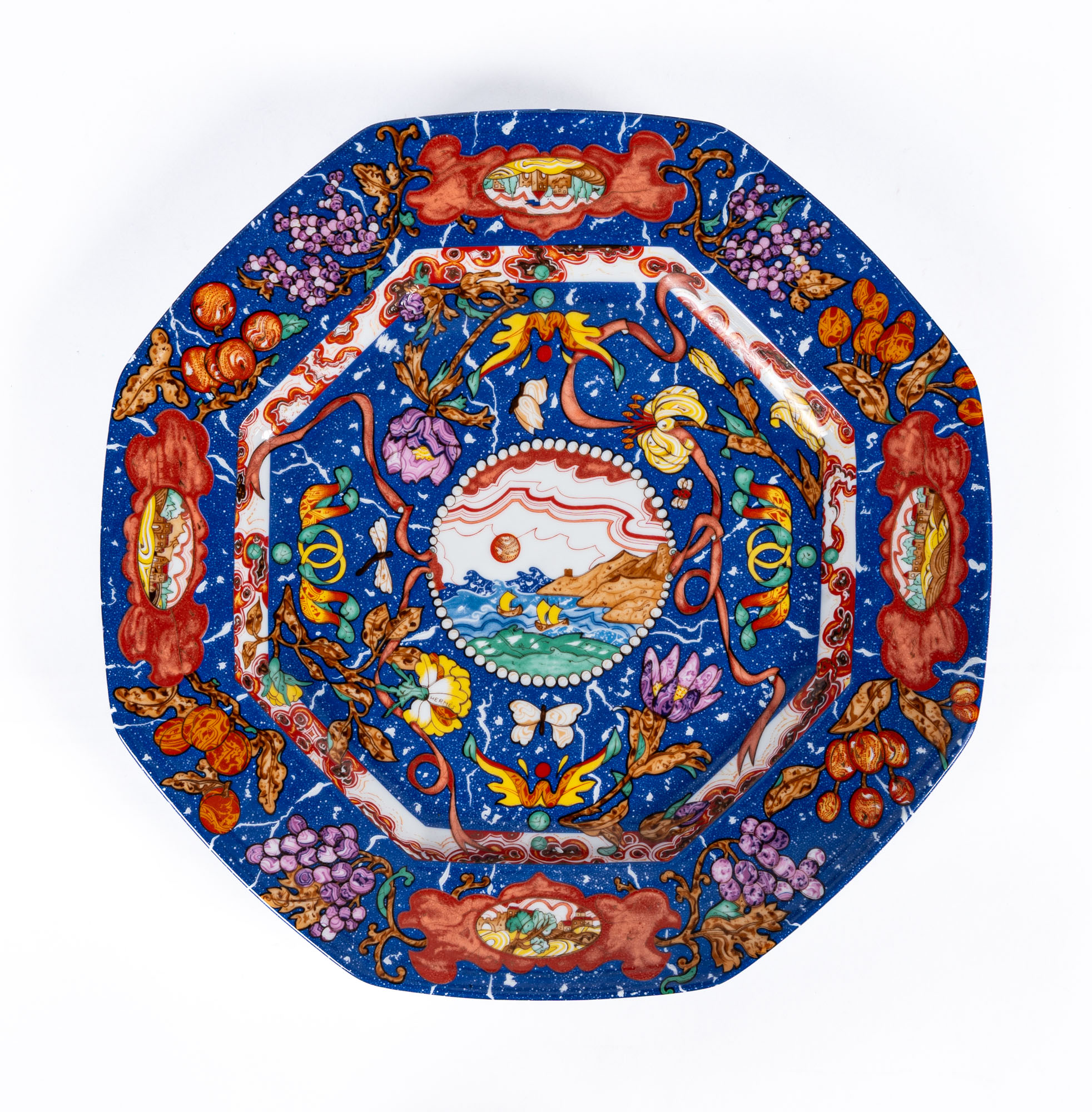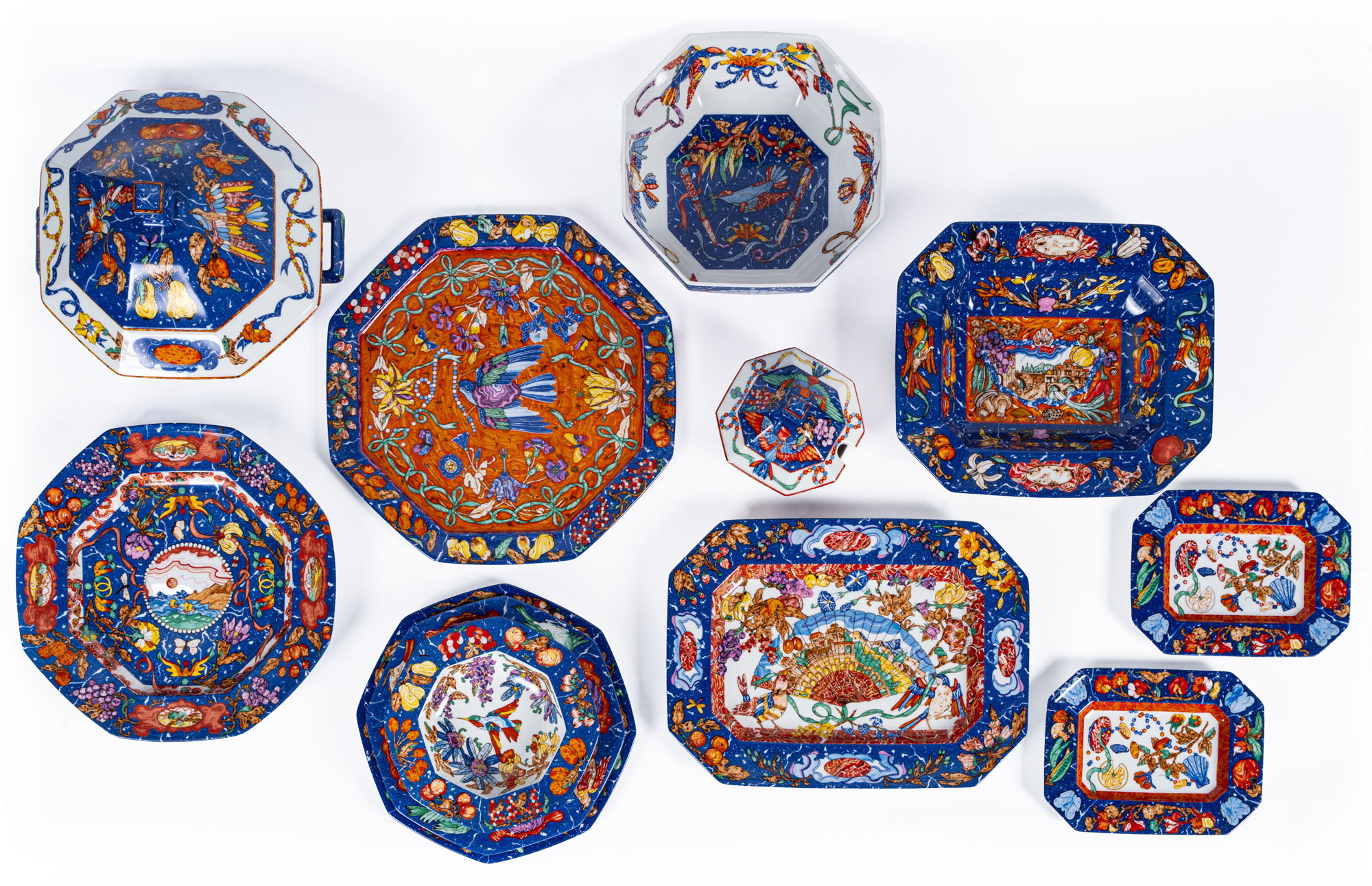 HermèsServizio di piatti da tavola 'Marqueterie de Pierres d'Orient et d'Ocident'1989In porcellana Limoges, simbolo grafico con 'Hermes Porcelaine'; 'H Limoges France'.Il servizio per 8 persone conta 40 pezzi ed è così composto: 8 piatti fondi, 8 sottopiatti, 8 piatti piani, 1 zuppiera con coperchio, 1 insalatiera, 2 piccoli vassoi rettangolari, 1 formaggera ottagonale con coperchio, 1 piatto rettangolare da portata, 1 piatto ottagonale da portata, 1 piatto ottagonale da dolci.In ottime condizioni