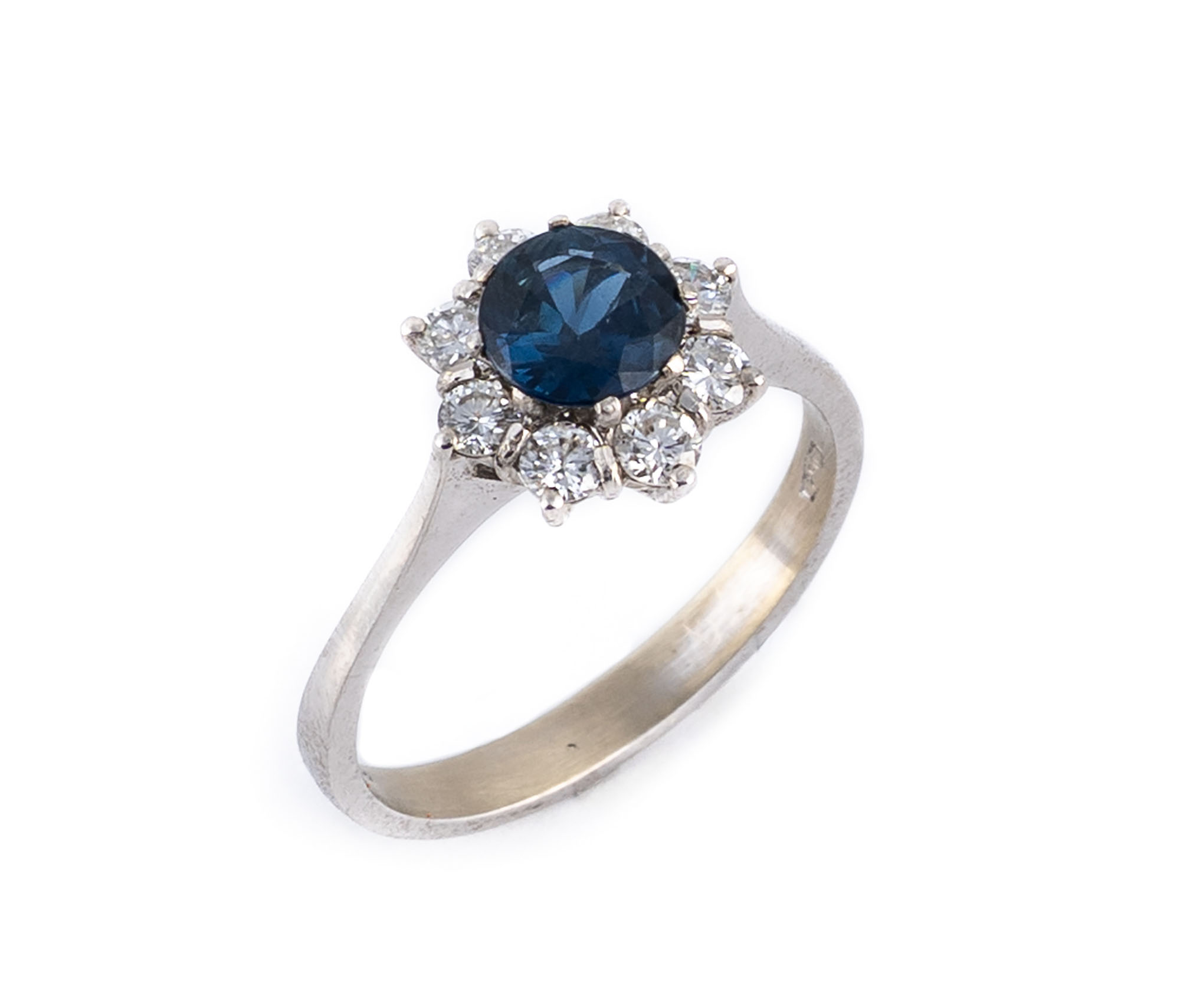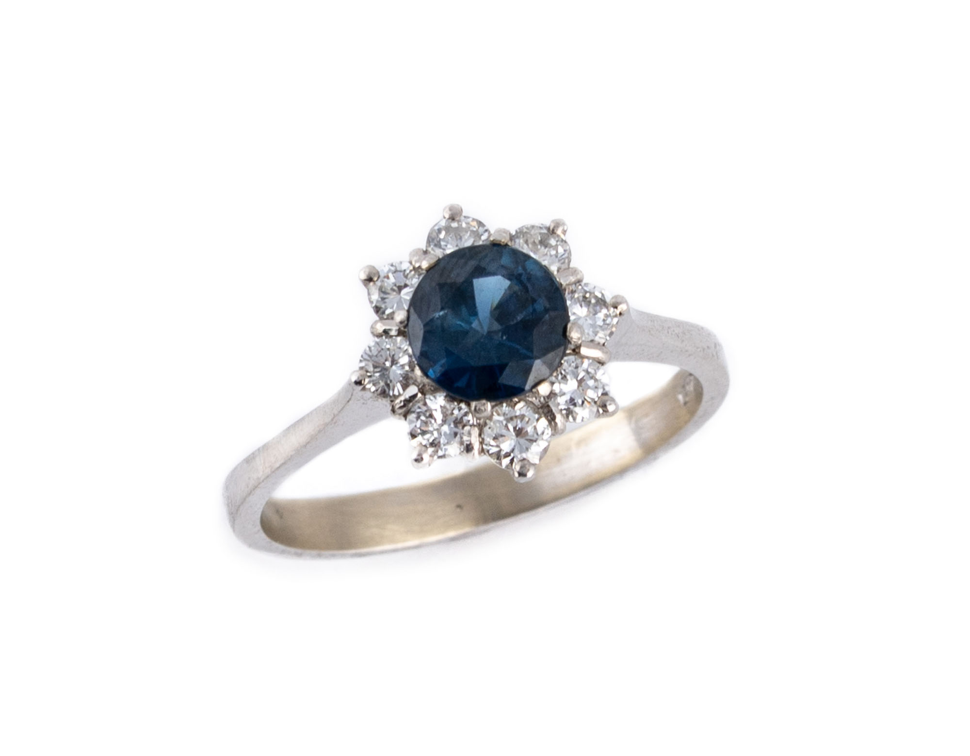 Anello in oro bianco 18kt con zaffiro taglio rotondo di ct 0.80 ca contornato da diamanti taglio brillante per ct 0.55 ca