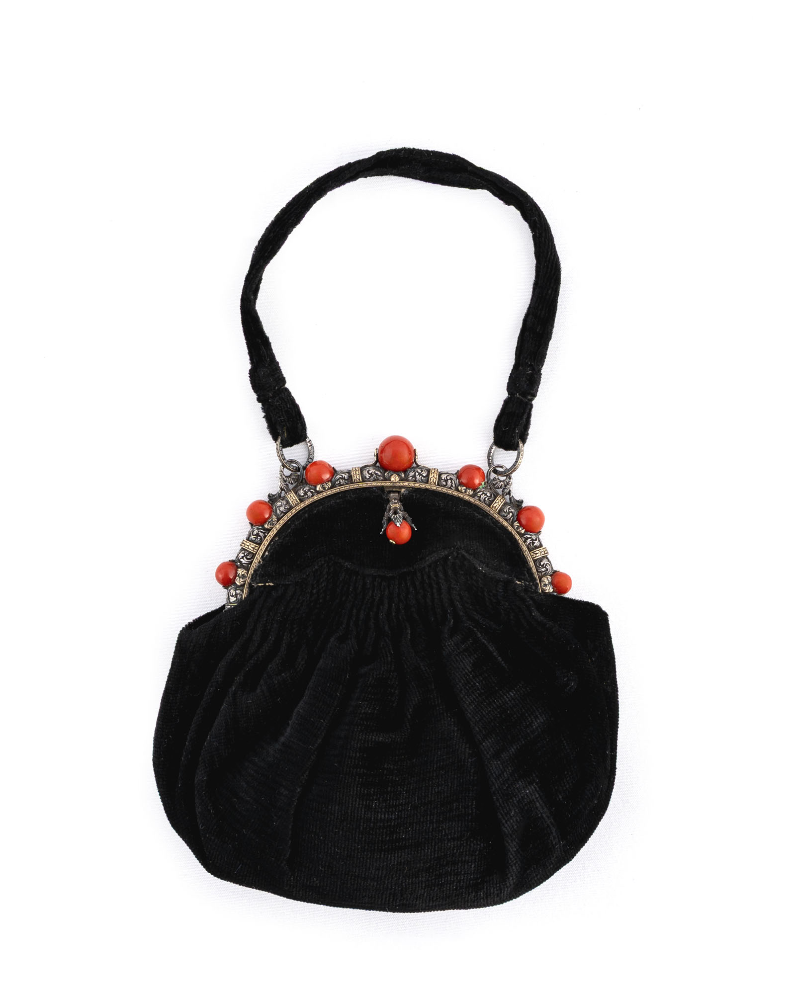 Buccellati, borsetta da sera in argento e corallo,1930 caBorsetta in velluto nero morbido con parte superiore arricciata e con montatura in argento lavorato con un decoro finemente traforato e cesellato, impreziosito da boules in corallo rosso. Manico in vellutoGr 63.3813 x 11 cm ca