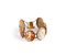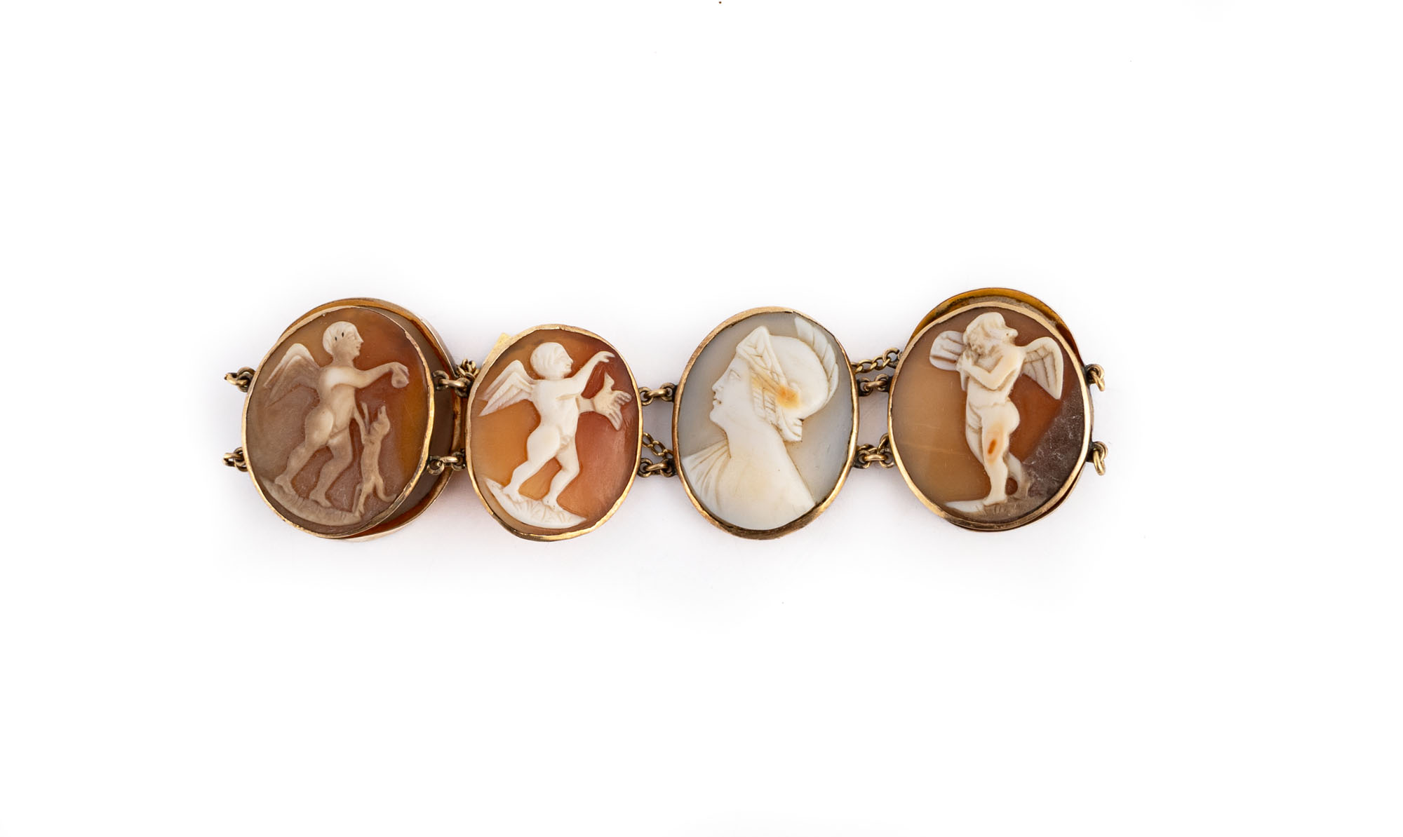 Bracciale in oro rosa a basso titolo realizzato con sei cammei in conchiglia raffiguranti figure mitologiche e cherubini. Difetti. Chiusura a cricchetto e catenella di sicurezza