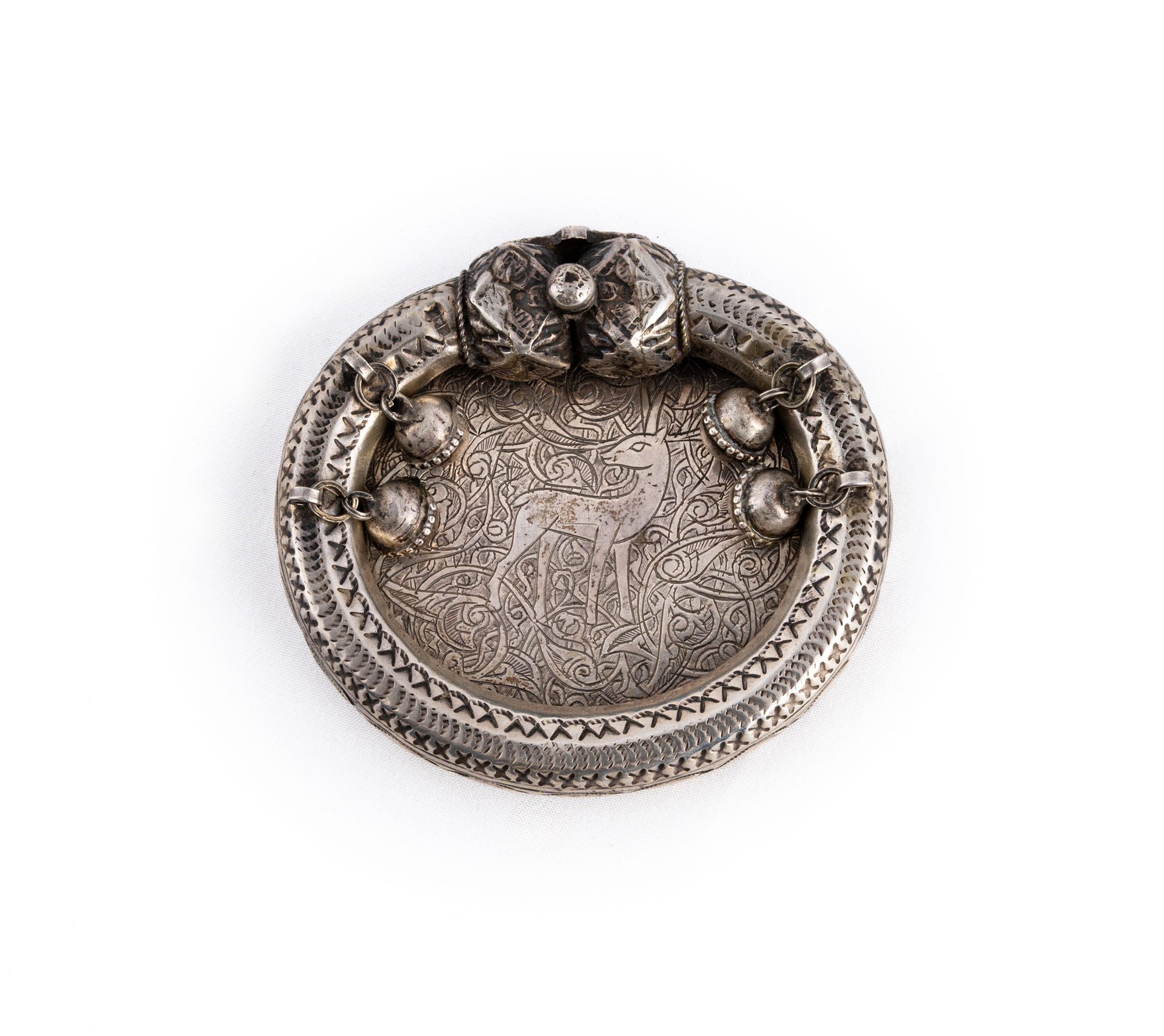 Posacenere di forma ovale con bordi rialzati arrotondati con quattro sonagli. La parte centrale decorata da fini incisioni orientaleggianti e da una gazzella