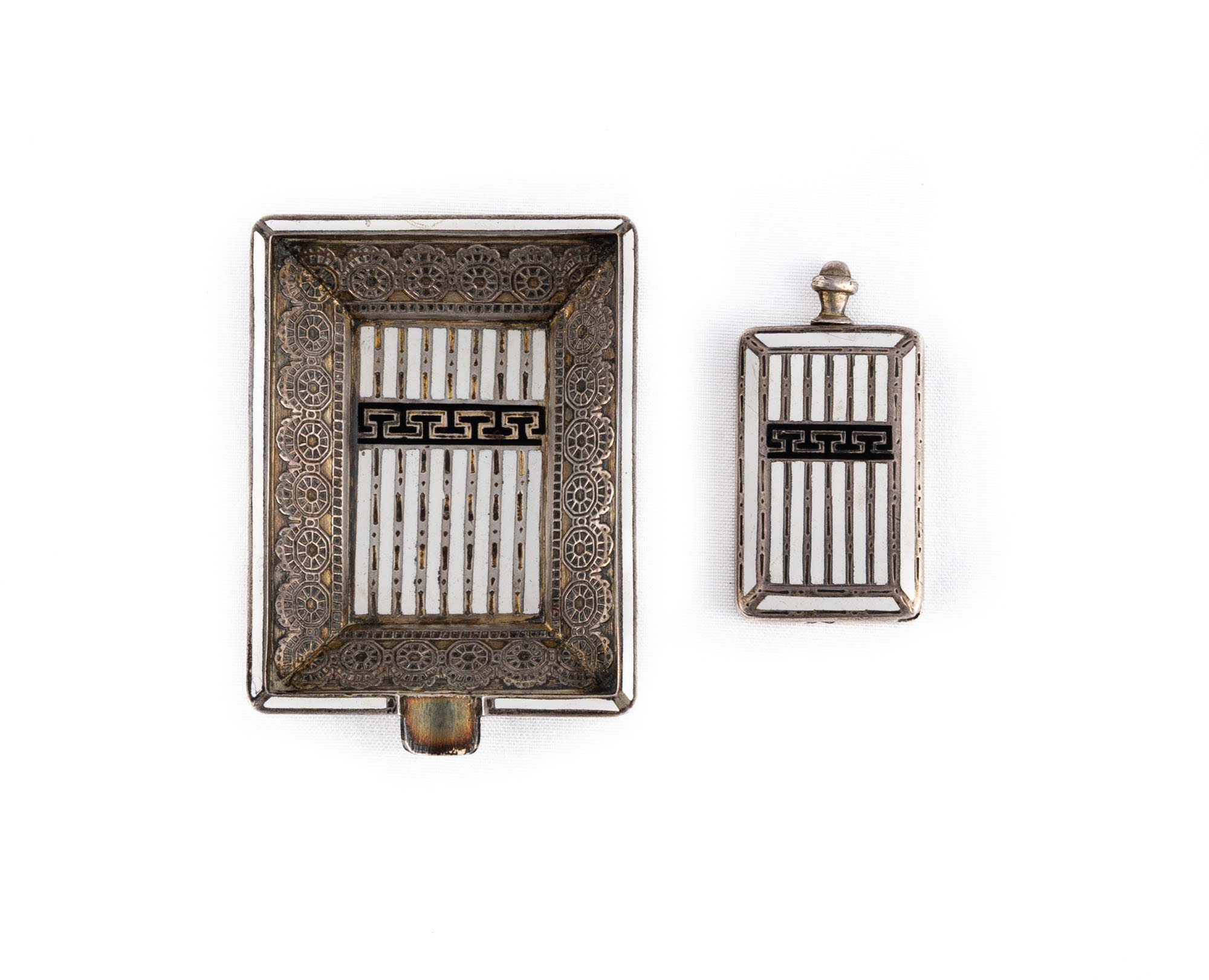 Posacenere e accendino in argento, Francia, 1930 caPiccolo posacenere e accendino dotato di uno stoppino. Entrambi con dettagli in smalto a righe bianche e nereGr 49.9Dimensioni posacenere 6.0 x 4.5 cmDimensioni accendino 4.5 x 2.3 cm