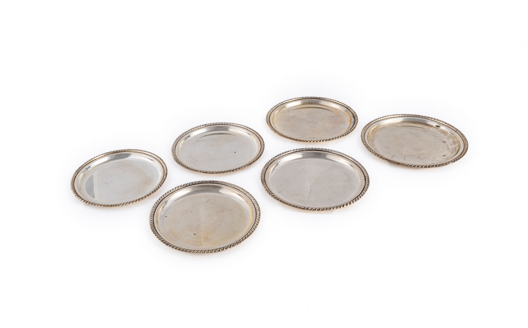 Sei piattini da pane, Italia, XX secoloDi forma circolare decorati con un bordo cordonatoGr 337.4Diametro 11.4 cm