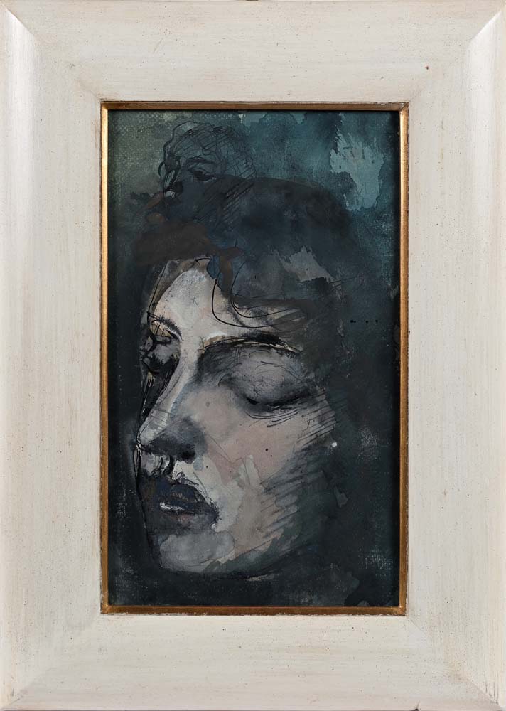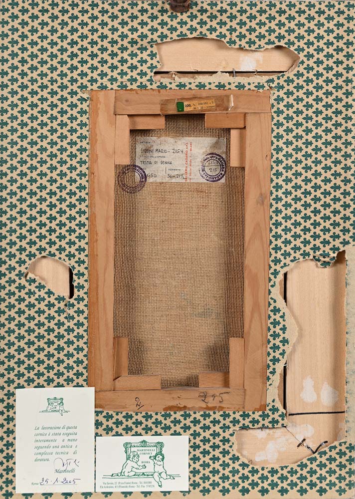 Testa di donna 1950 Al verso reca etichetta con timbro della Galleria Cadario, Milano. Inchiostro e tempera diluita su carta applicata su tela cm 36x21,5 - in cornice cm 51x36 Certificato di autenticità rilasciato dall'Associazione Mario Sironi, Milano