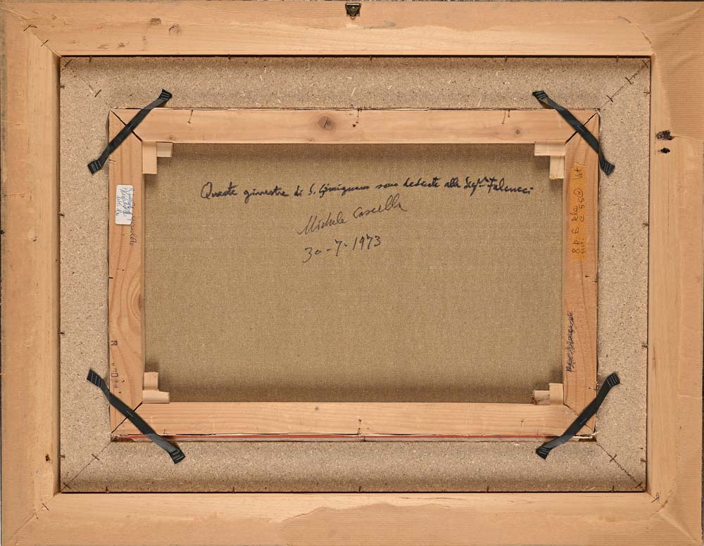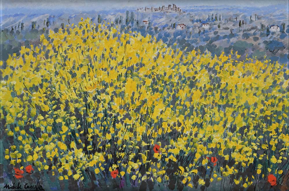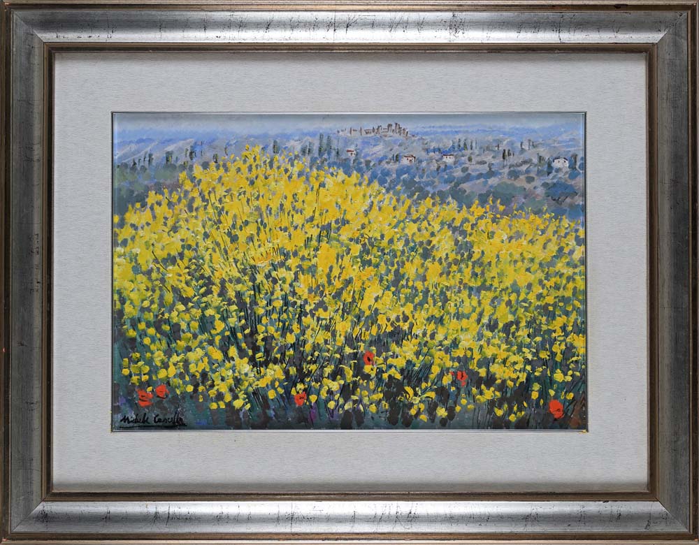 Ginestre di S. Gimignano Firma in basso a sinistra "Michele Cascella". Al verso reca dedica, firma e data "Queste Ginestre di S. Gimignano sono dedicate alla Signora Falcucci, Michele Cascella, 30.7.1973" Olio su tela cm 40x60 - in cornice cm 68x87