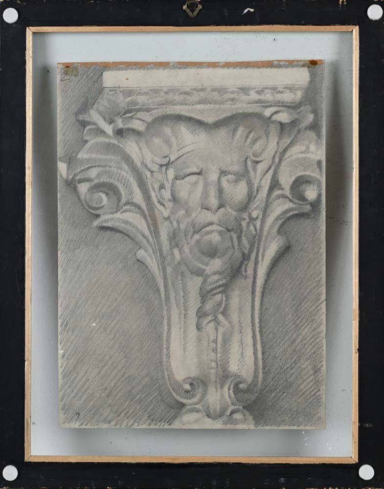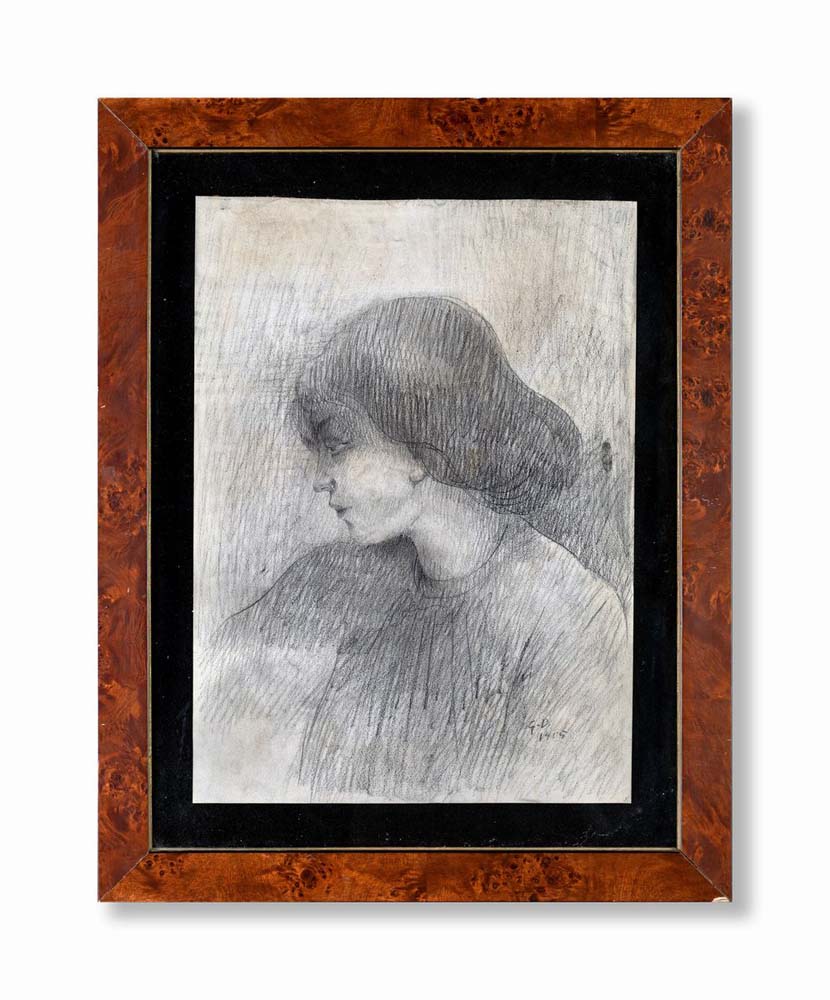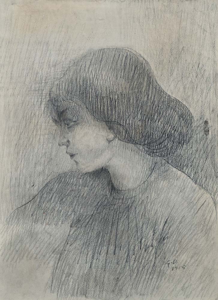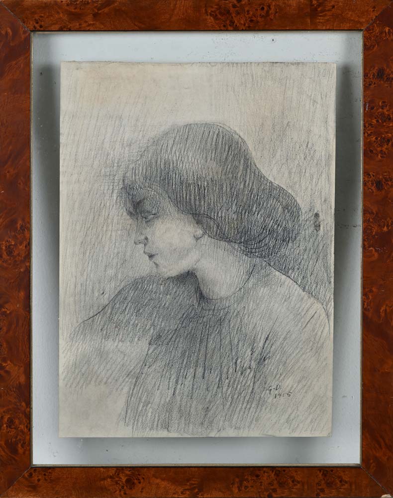 Ritratto della sorella 1905 Siglato e datato sul fronte in basso a destra "G.D. 1905". Al verso reca un altro disegno a matita intitolato "Studio per elemento decorativo" Matita su carta 47x34,5 Catalogo Generale Ragionato Gerardo Dottori. Tomo Secondo, a cura di Massimo Durante. Fabbri Editore, 2006,p. 678, n. 1054A - 1054B