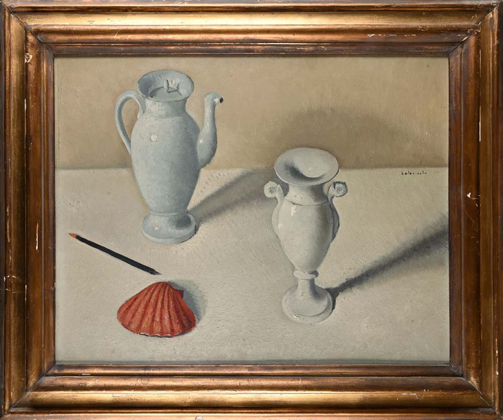 Natura morta con brocca e conchiglia rossa Firma in alto a destra "Colacicchi" Olio su tavola cm 54x68 - in cornice cm Coll. Alberto Carocci, Roma