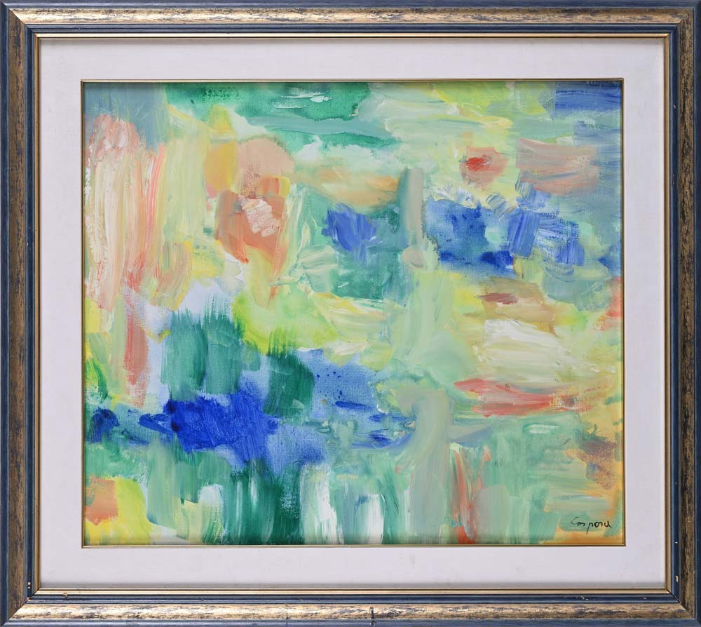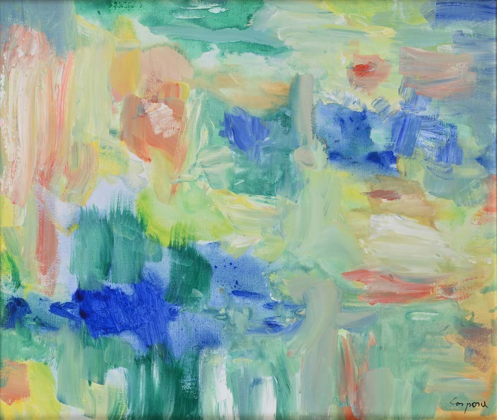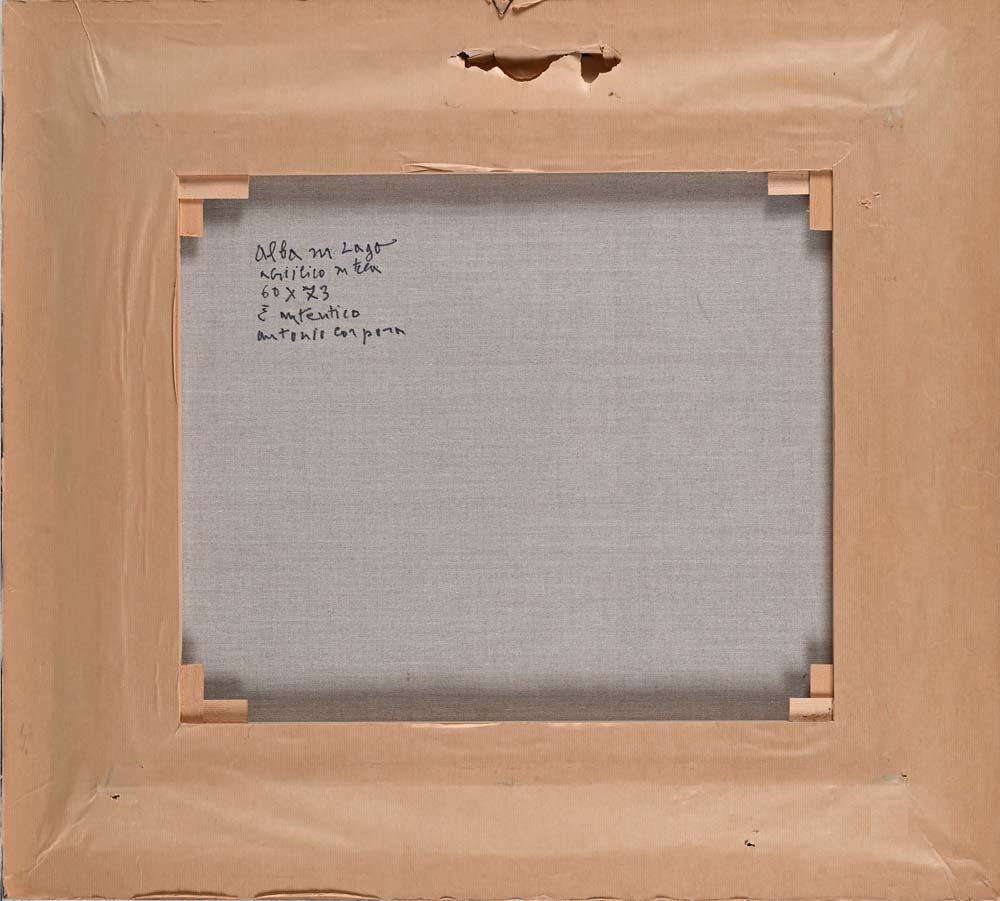 Alba su lago Firma in basso a destra "Corpora". Al verso reca titolo e autentica di pugno dell'artista Acrilici su tela cm 60x73 - in cornice cm 80x90 Corpora, Catalogo ragionato generale dei dipinti, Vol. II, pag. 394 n. 576
