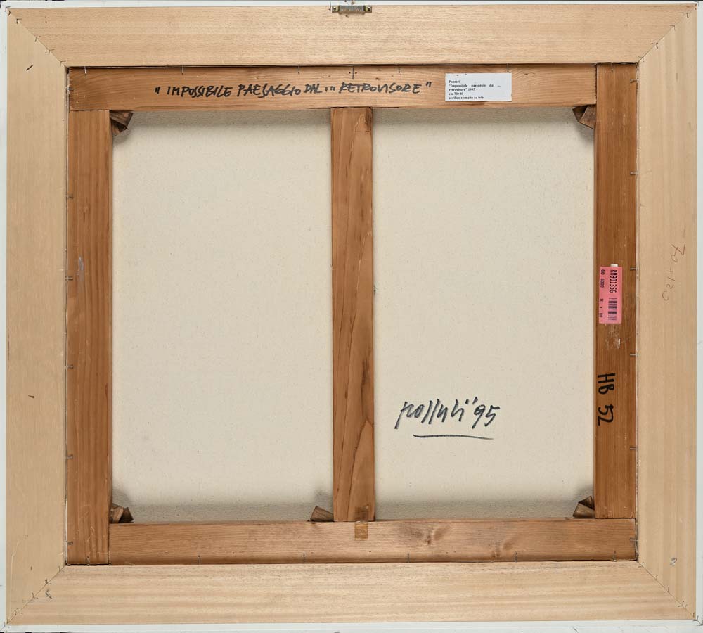 Impossibile paesaggio dal retrovisore 1995 Firma e data al verso "Pozzati '95". Sul telaio al retro reca titolo Acrilici e smalti su tela cm 70x80 - in cornice cm 89x99