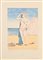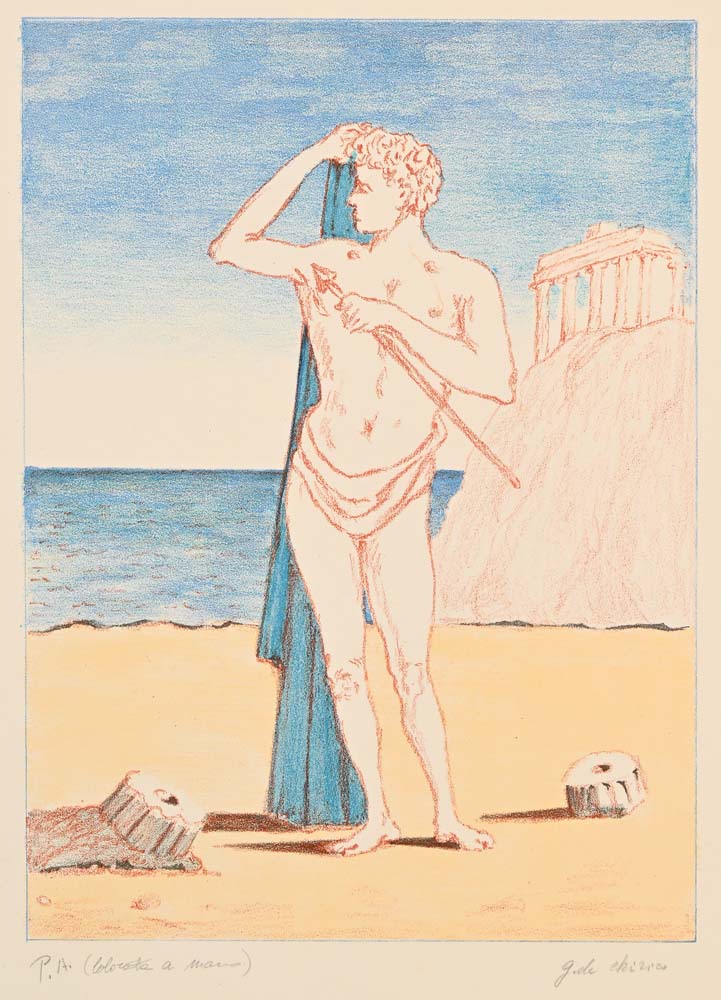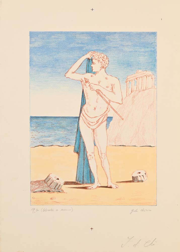 Figura con mantello azzurro Firma e numerazione "G.De Chirico P.a. Colorata a mano" Litografia e acquarello cm 50x35 Certificato di autenticità rilasciato dallo stampatore Alberto Caprini, Roma
