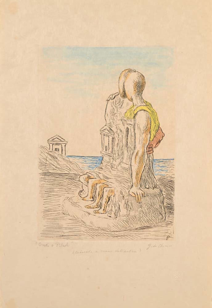 Oreste e pilade 1963 Firma, titolo e numerazione "G. De Chirico, Oreste e Pilade, Colorata a mano dall'autore". Timbro a secco "Alberto Caprini Stampatore in Roma" e "Giorgio De Chirico" Acquaforte e acquarello su carta cm 57x38,5 Certificato di autenticità rilasciato dallo stampatore Alberto Caprini, Roma
