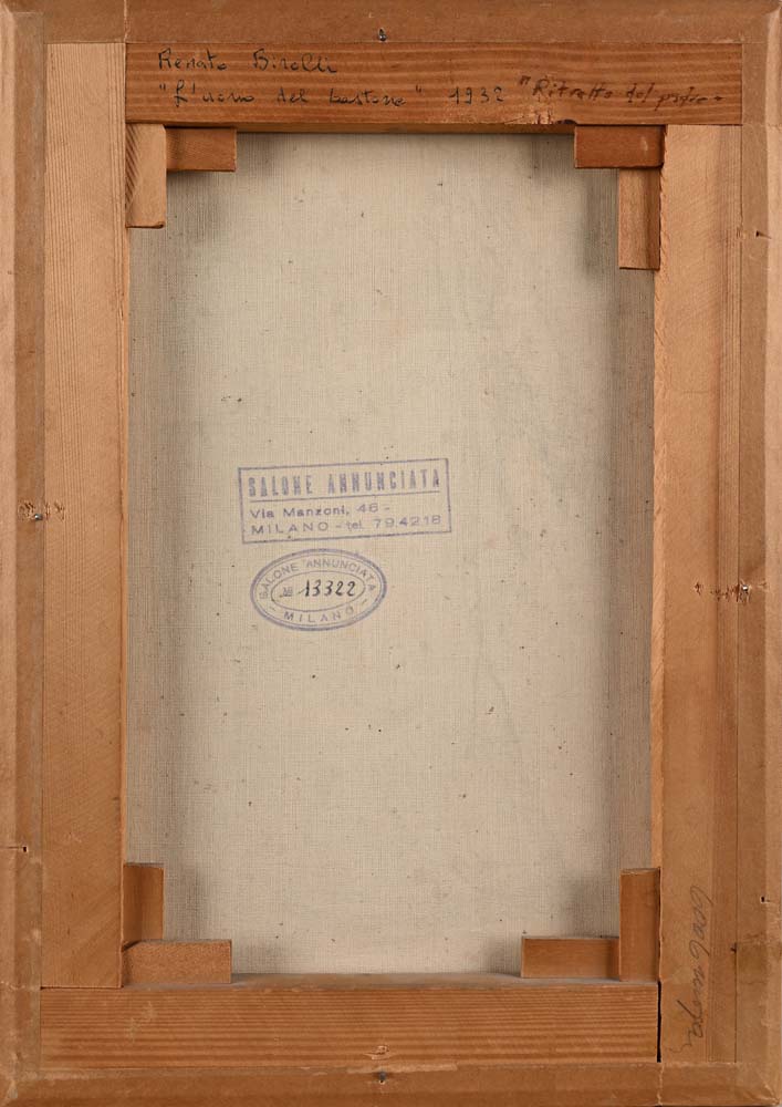L'uomo del bastone - ritratto del padre 1932 Firma e data in alto a sinistra "R. Birolli 1932". Al verso reca sul telaio titolo. Timbri della Galleria Annunciata, Milano Inchiostro e acquarello su carta applicata su tela cm 35x24,5