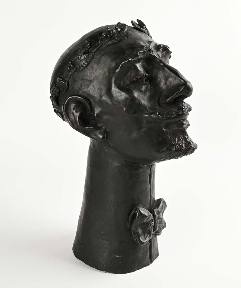 Ritratto di Gabriele d'Annunzio coronato di alloro Scultura in terracotta dipinta di nero cm h 40x25x25