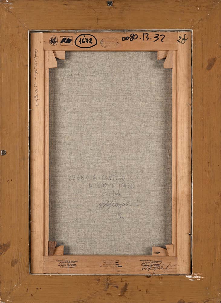 Fiori Firma in basso a destra "Masci". Al verso autentica di pugno a firma non decifrata e timbri della Galleria d'Arte Il Selvaggio, Roma Olio su tela cm 60x40 - in cornice cm 75x55 Certificato di autenticità su fotografia firmato e rilasciato da Sissi Aslam