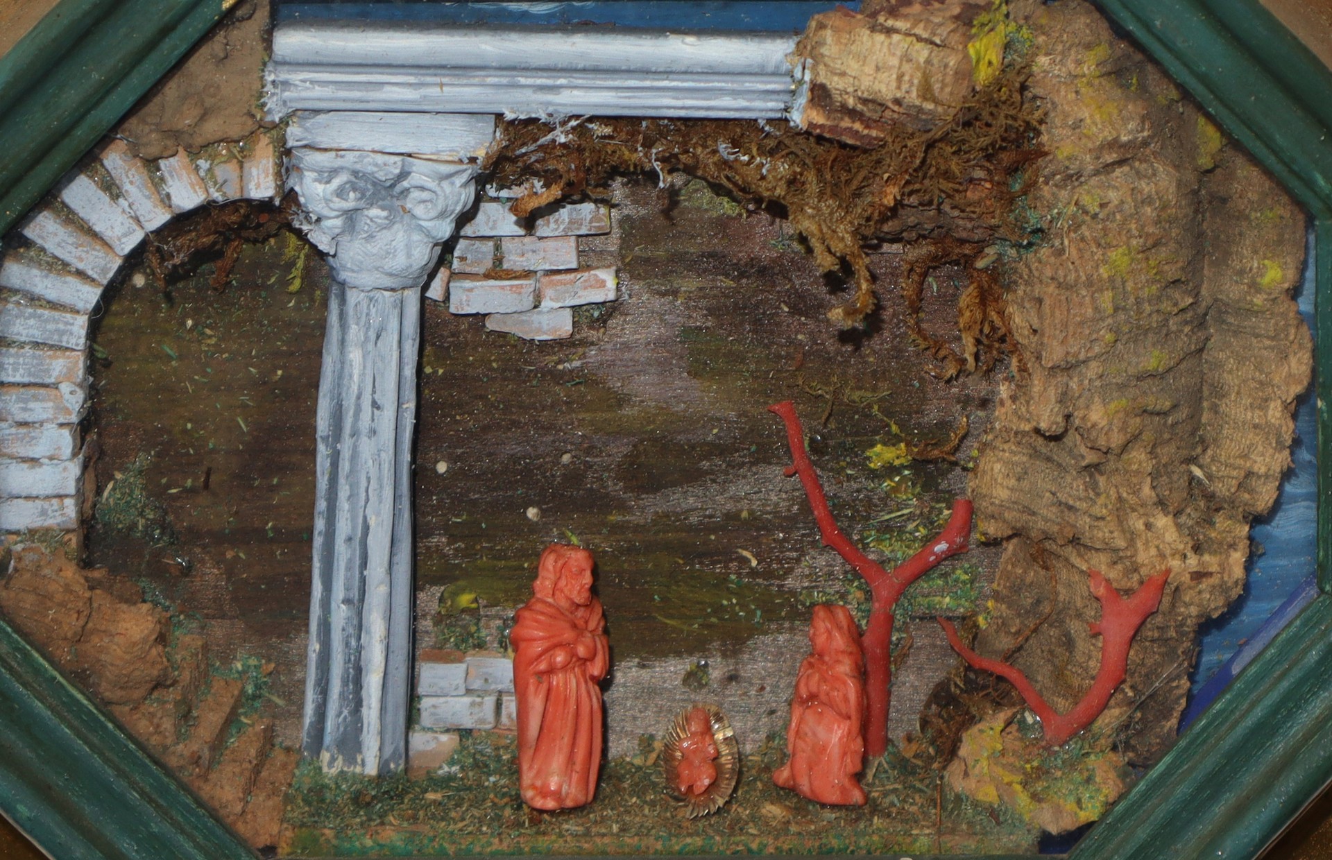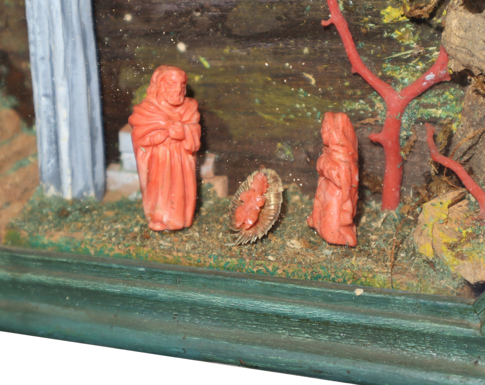 Presepe in corallo rosso entro cornice in legno dorato cm 25,5x31x 8