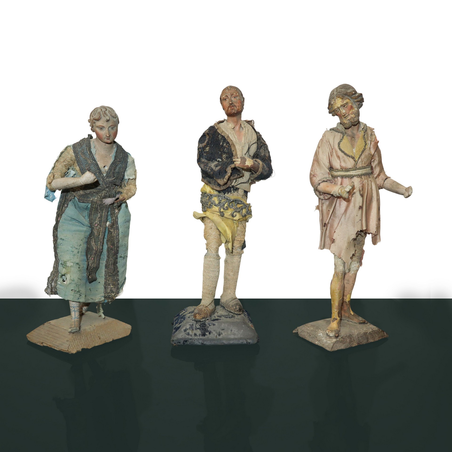 N°3 Statue di pastori genovesi con busto mani e piedi in terracotta, occhi dipini e abiti in tessuto e crine , 19° secolo h cm 27, h cm 30, h cm 32