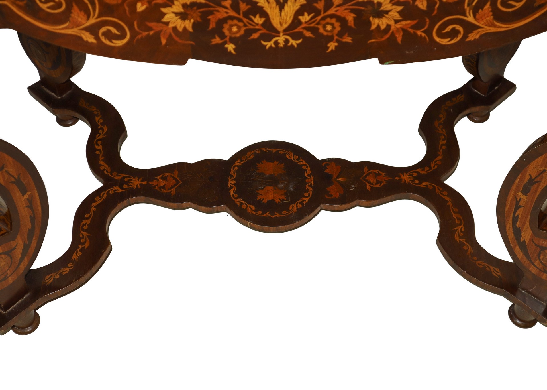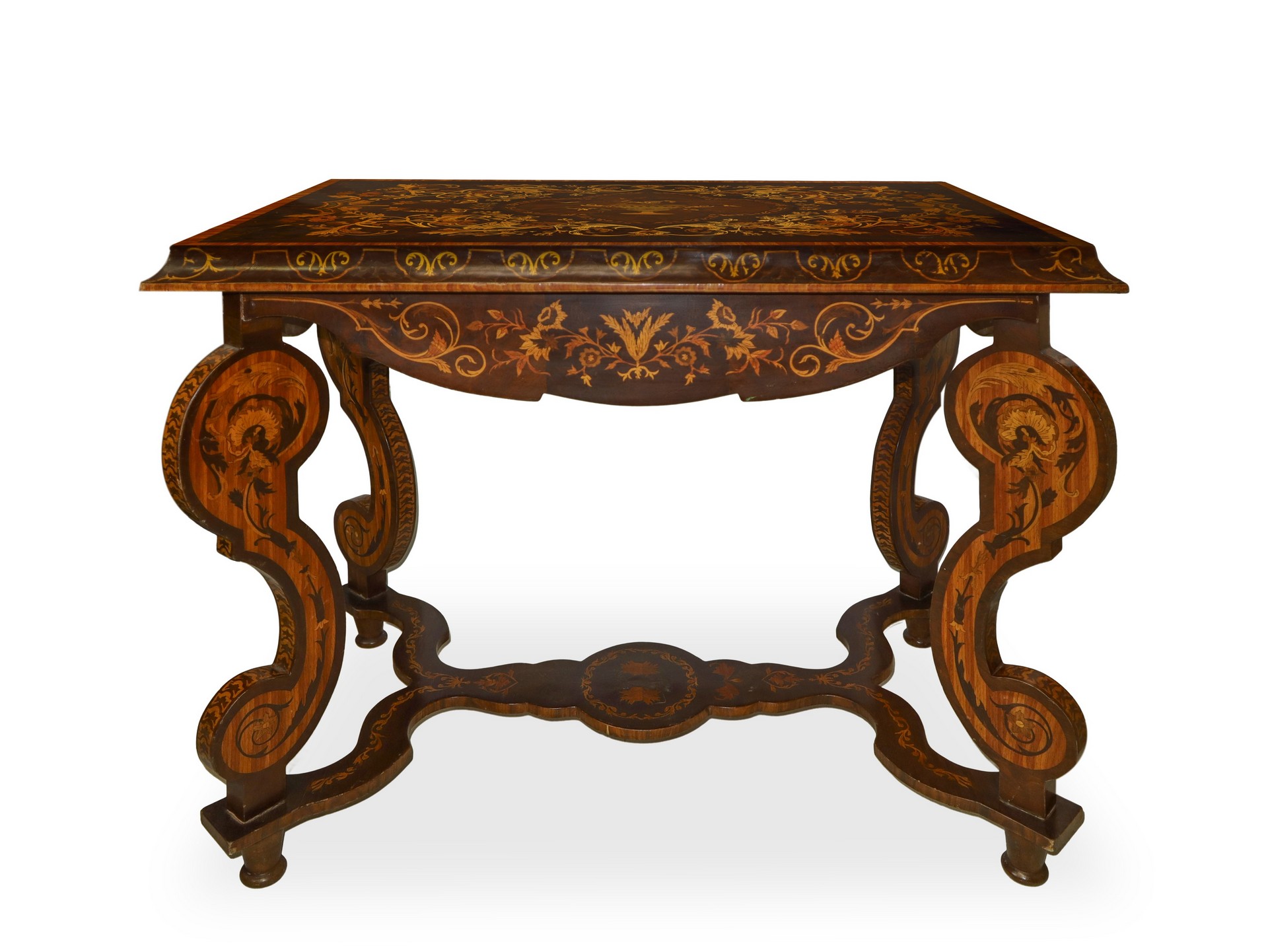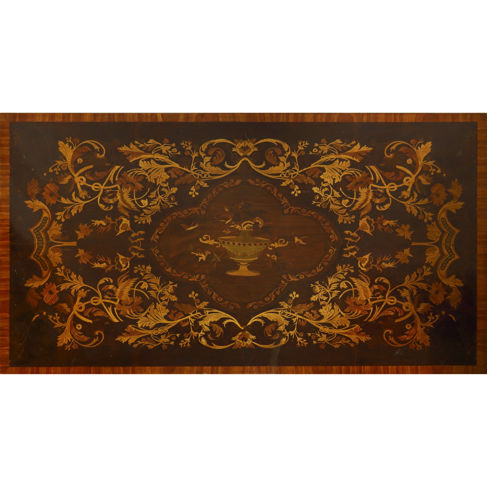 Tavolinetto rettangolare con intarsi di carattere floreale in legni vari e colorati, France fine 19th/20° secolo h cm 88X98X62