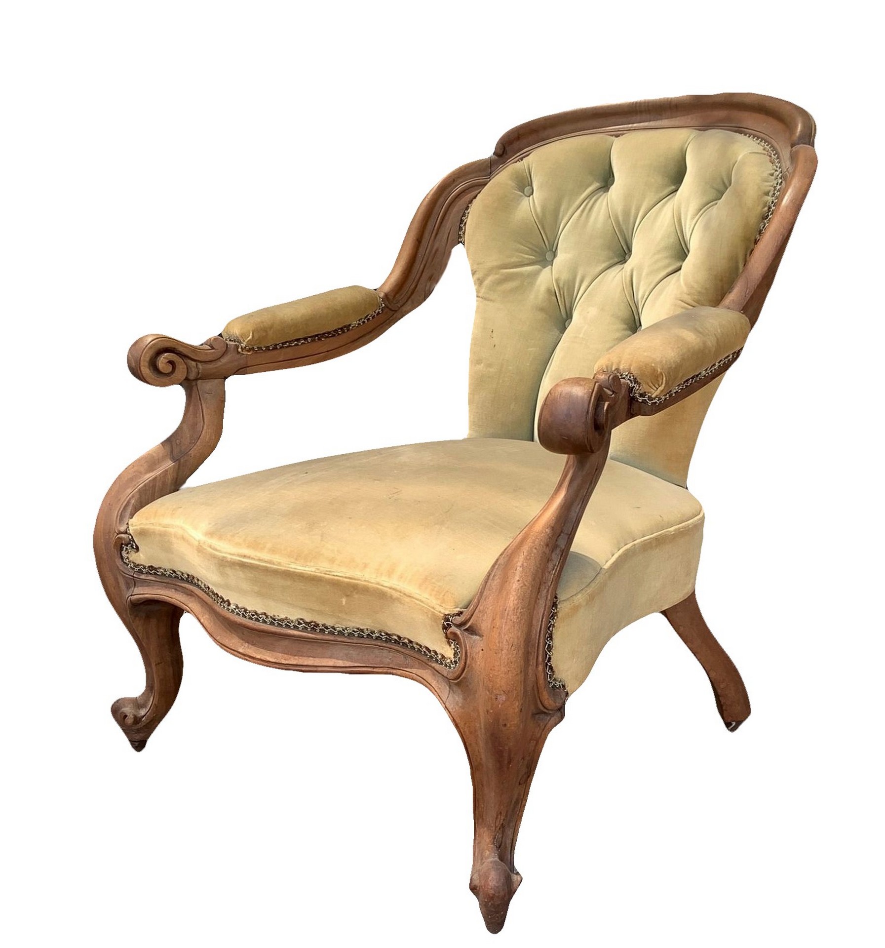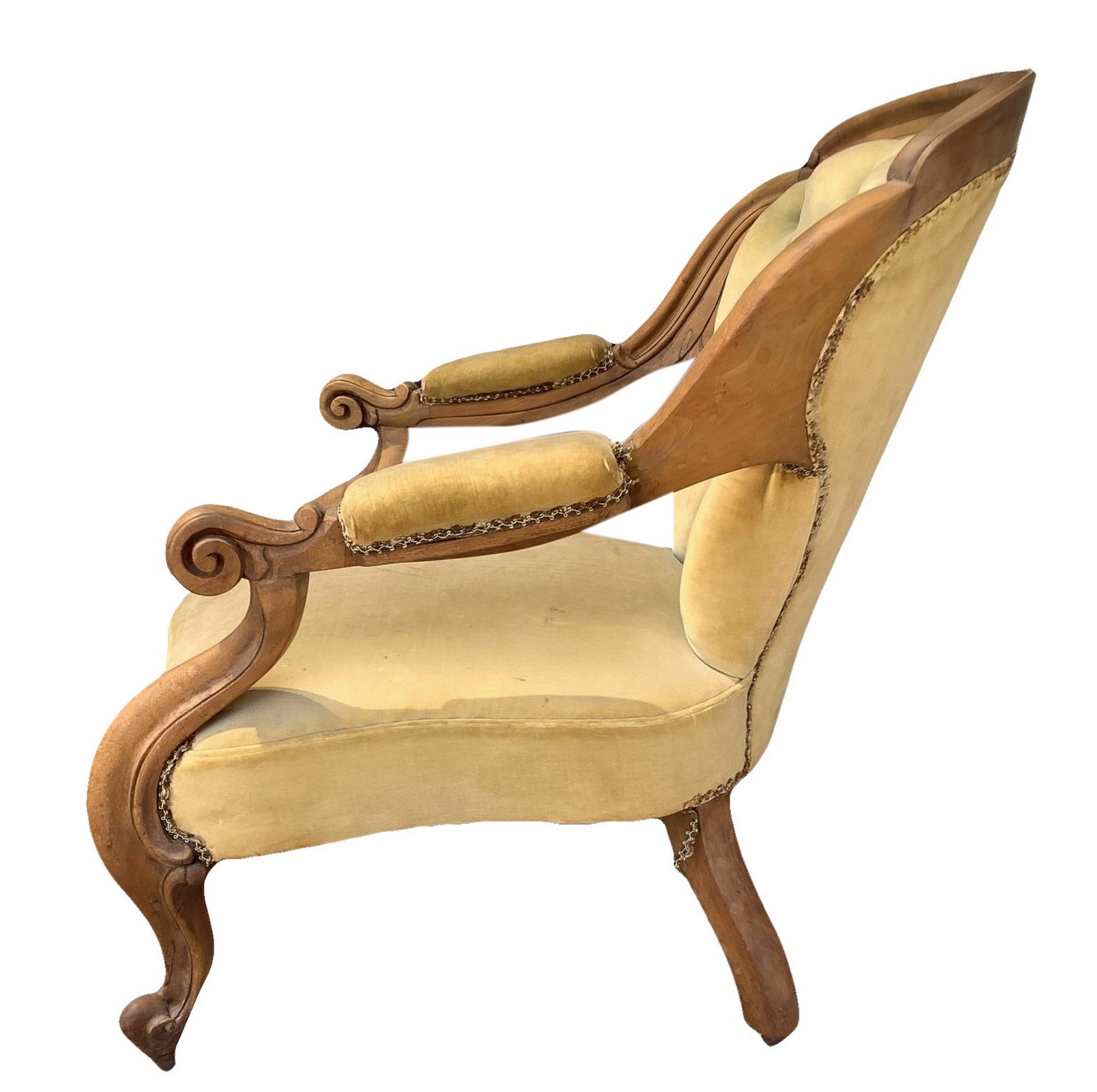 Poltrona, Louis-Philippe, 20° secolo h cm 83 x cm 70 x cm 90 In legno di noce, con tapezzeria color avana.