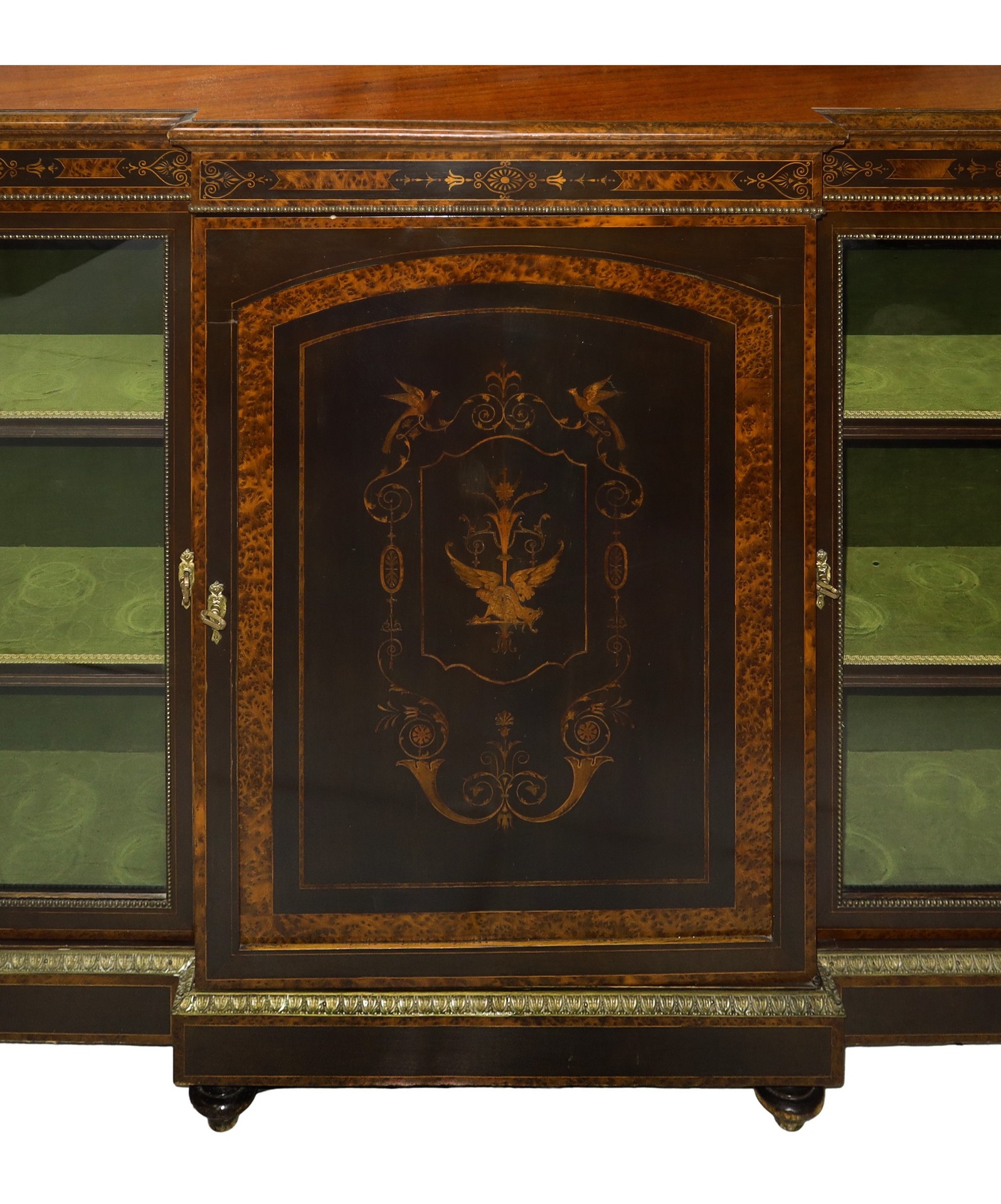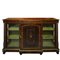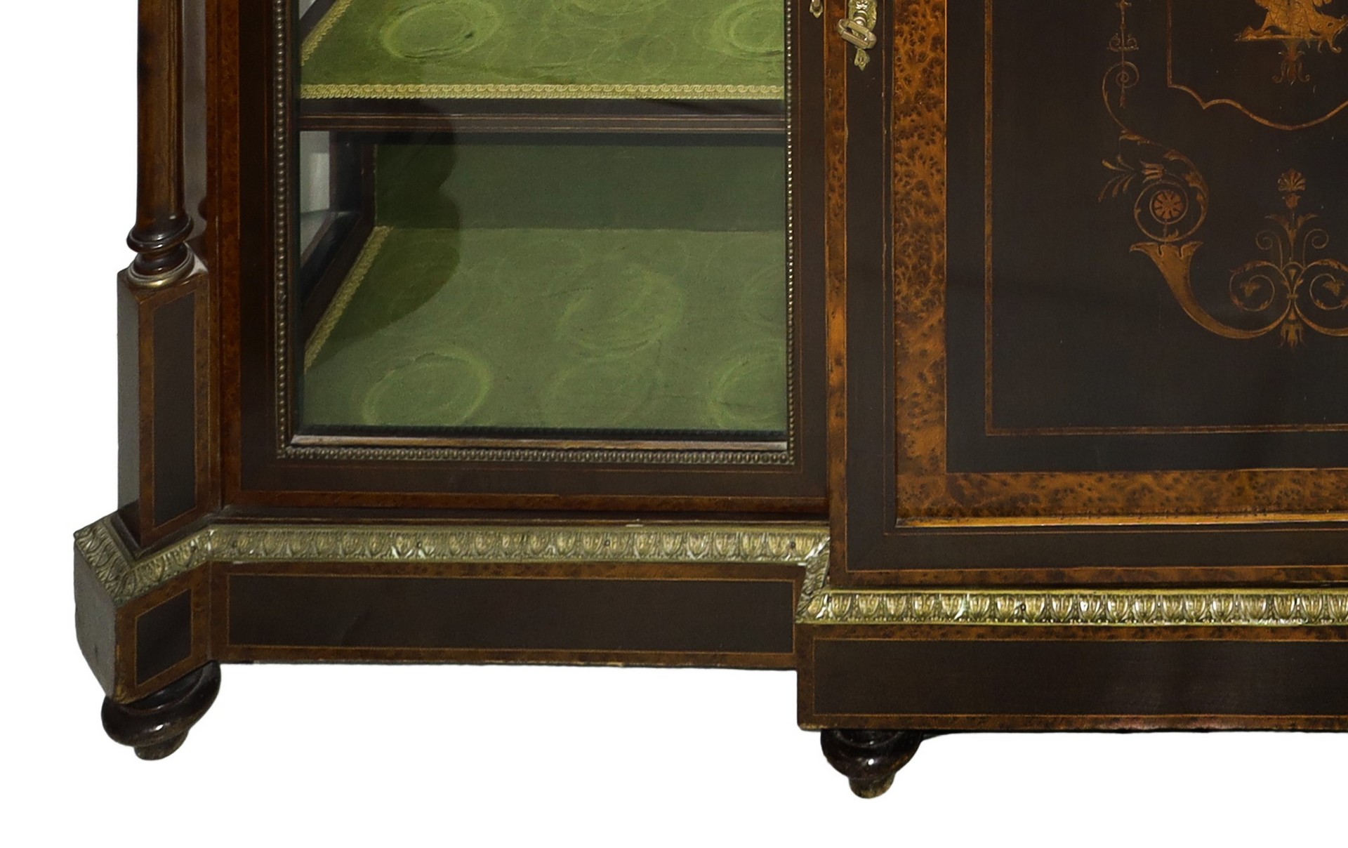 Etagere in legno di mogano con intarsi sul fronte, fine 19° secolo h cm 108X170X42 sportello centrale in legno intarsiato e sportelli laterali a vetri con sportello centrale intarsiato e colonne ai lati