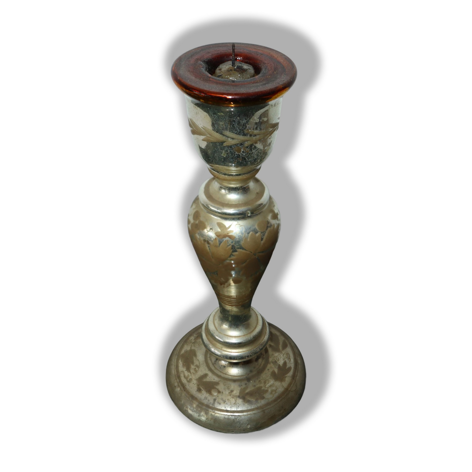 Candeliere monoforo in vetro di Murano argentato e decorato a motivi floreali
