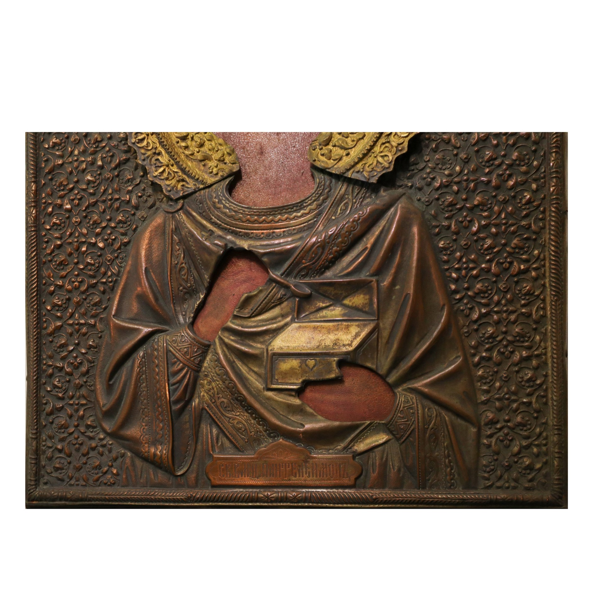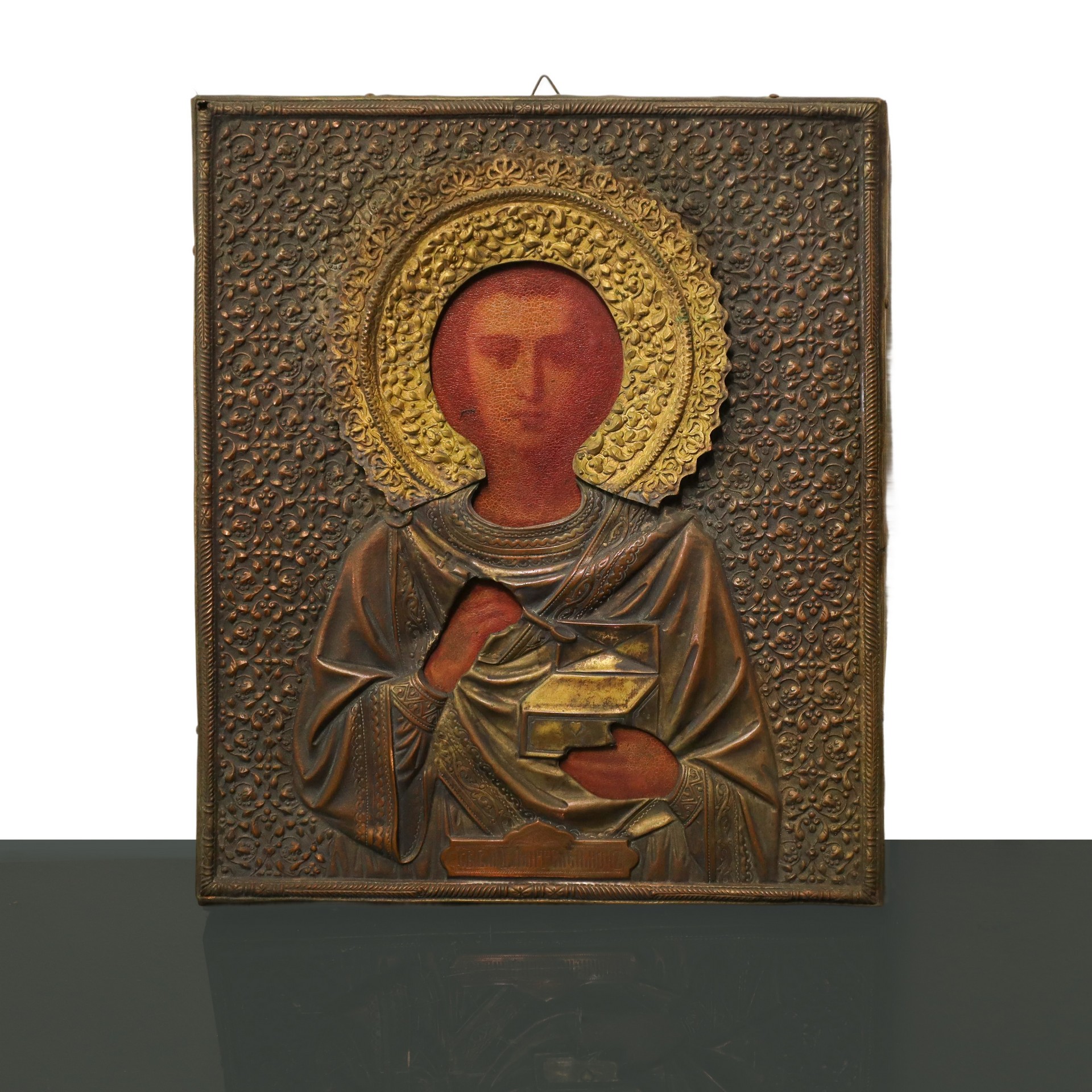 Icona russa con riza in rame cesellato e sbalzato raffigurante San Pantaleone, 19th/20° secolo