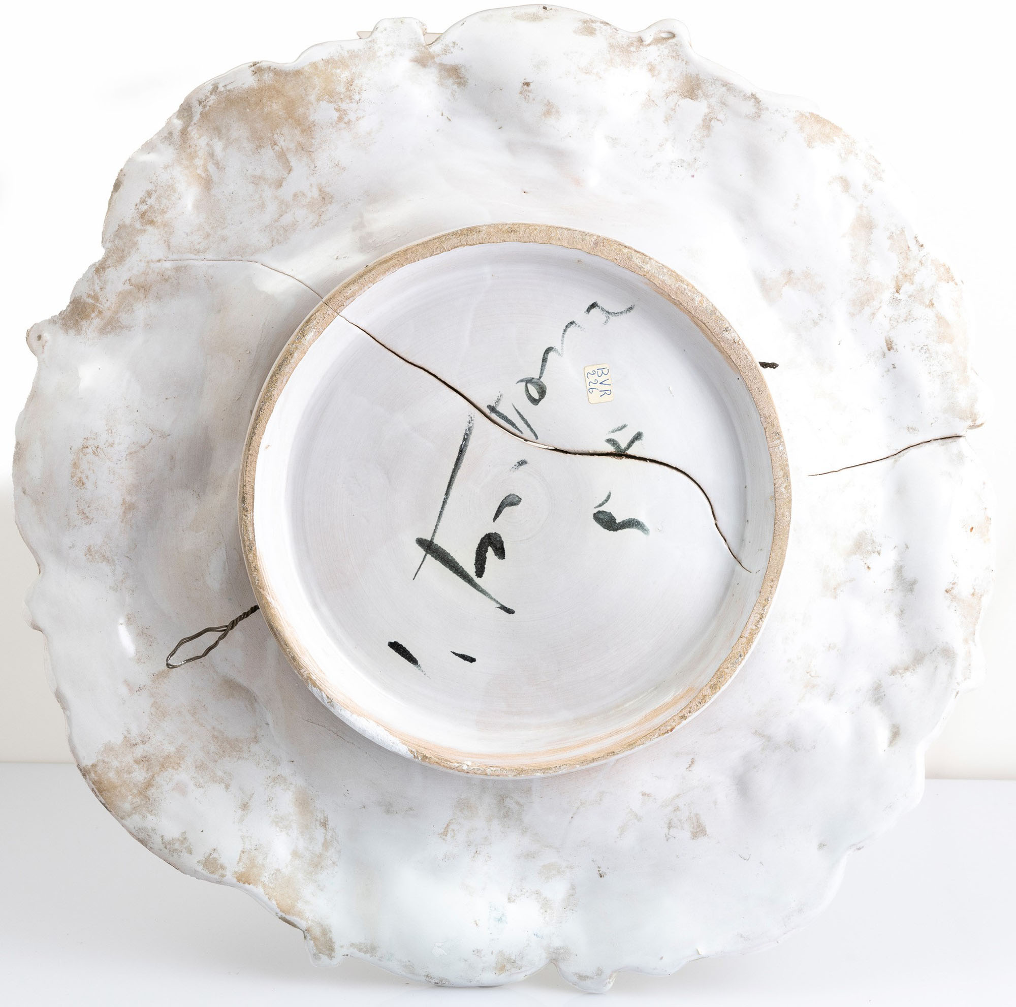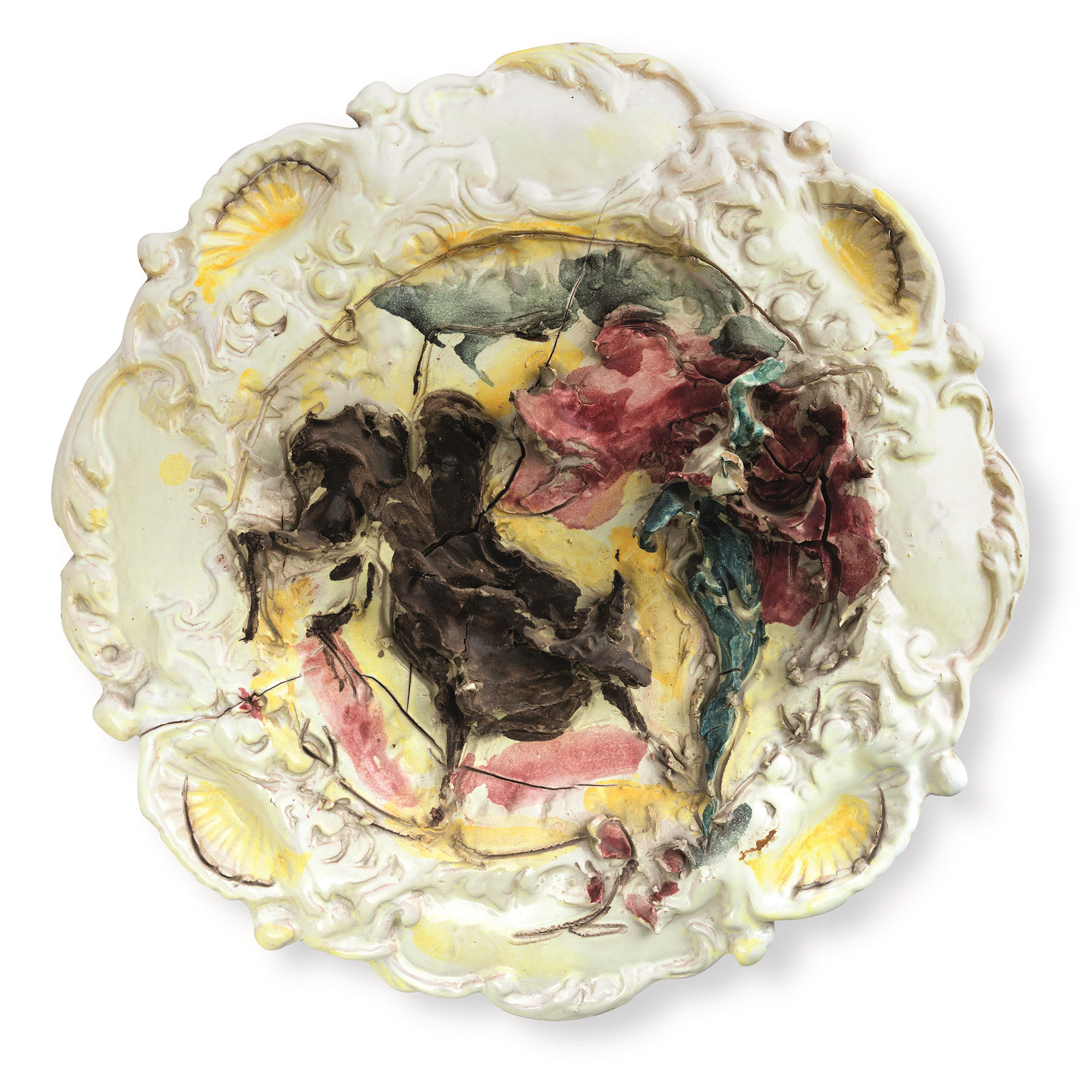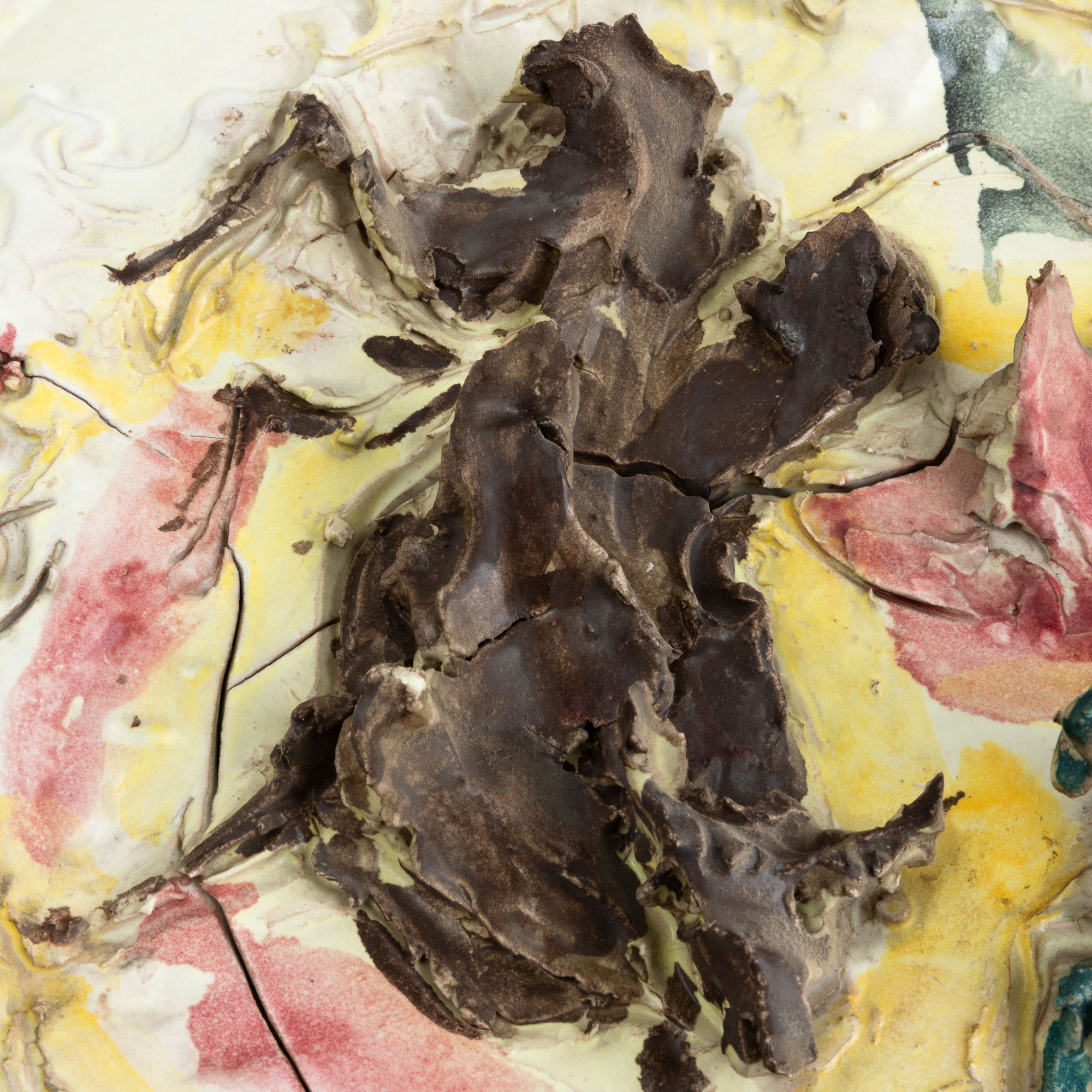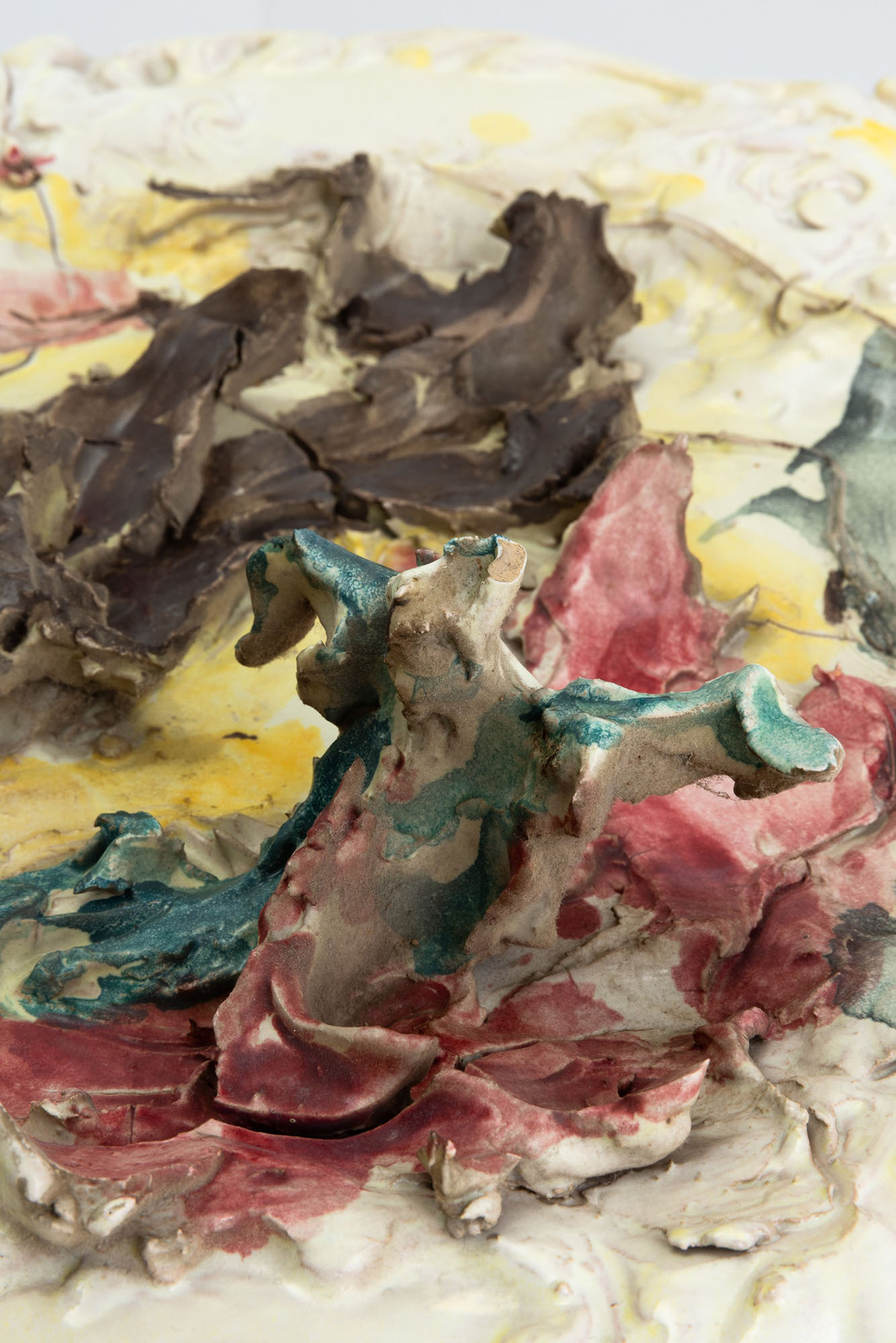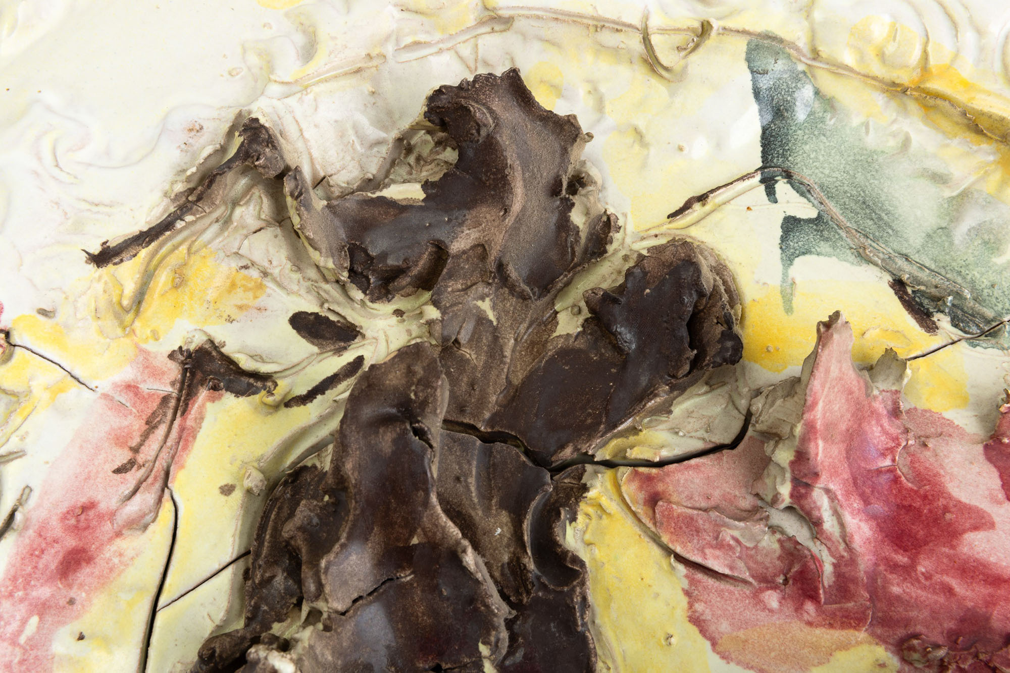 terracotta smaltata e dipinta nei colori del bianco, giallo, grigio, marrone, turchese e rosso