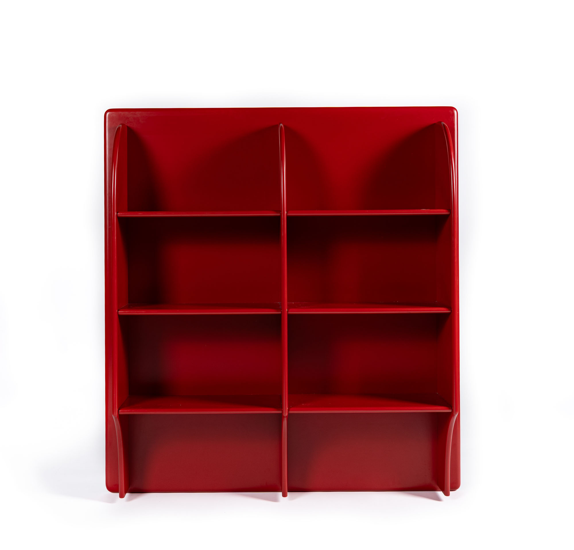 Librerie a parete con struttura in legno laminato laccato color rosso, produzione Azucena, Italia, 1960 circa