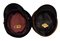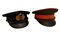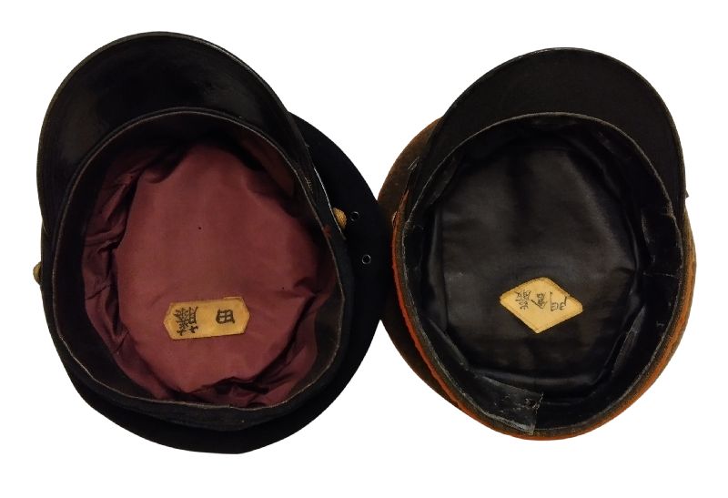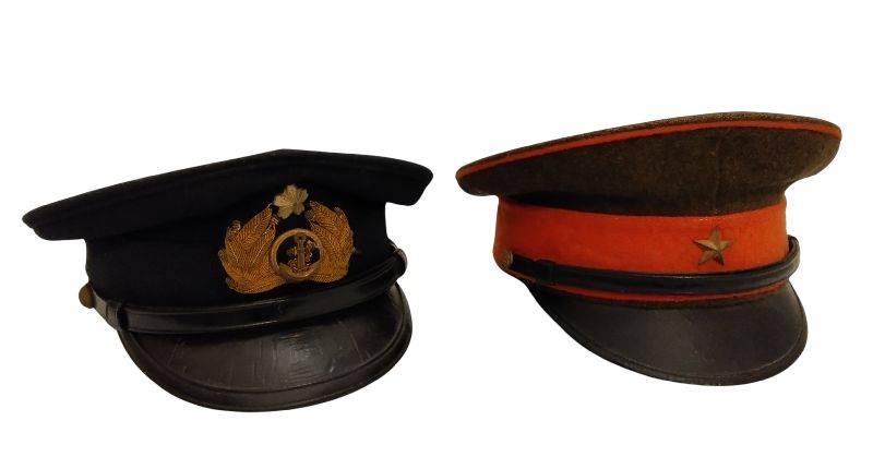 Due berretti giapponesi, uno dell'esercito, lana marrone profilato di rosso con banda alla circonferenza rossa ed uno della Marina imperiale da ufficiale, panno di lana blu con bel fregio frontale in canottiglia; in ottimo stato.