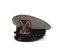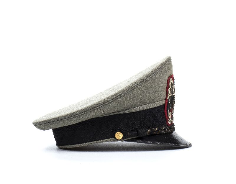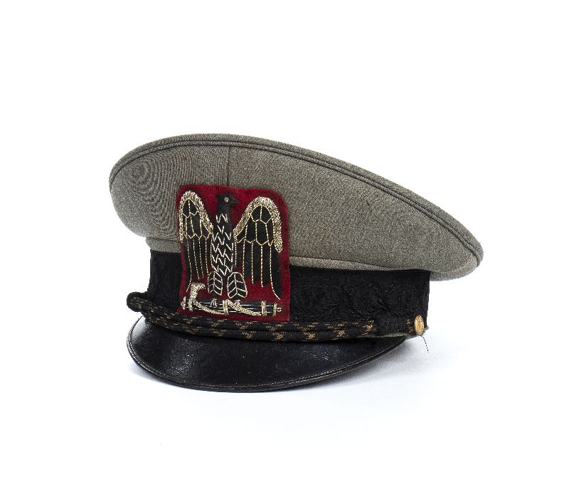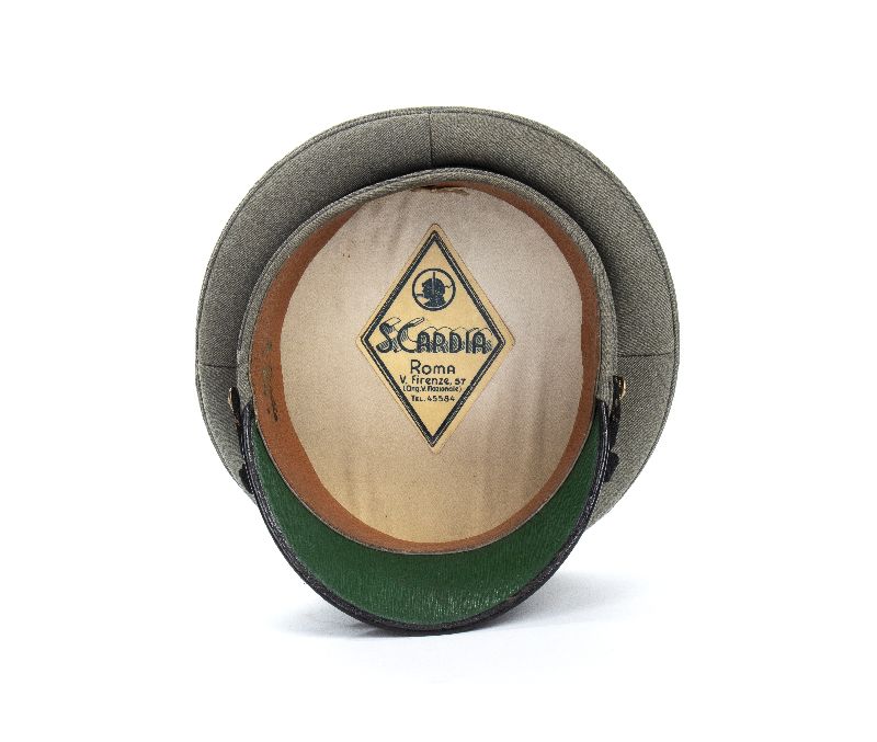 Bellissimo berretto in gabardina grigioverde con fascia damascata a fasci e fogliami, fregio frontale di aquila nera con inserti di canottiglia argento, soggolo nero screziato argento, bottoncini al soggolo pertinenti, con fasci littori, molto bello ed in ottimo stato, raro, in quanto usato solamente dal 1942 fino all'armistizio.