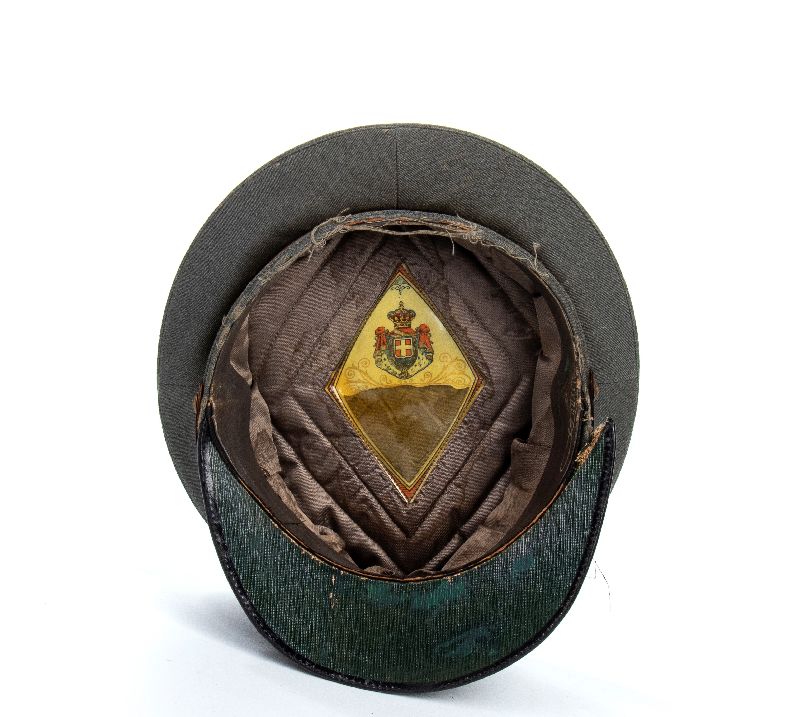 Berretto m.34 in cordellino grigio con gradi a lastra da tenente colonnello e fregio della Regia Guardia di Finanza con fiamma stretta dei primi anni 30, bottoni al soggolo pertinenti, in buono stato con alcune camolature.