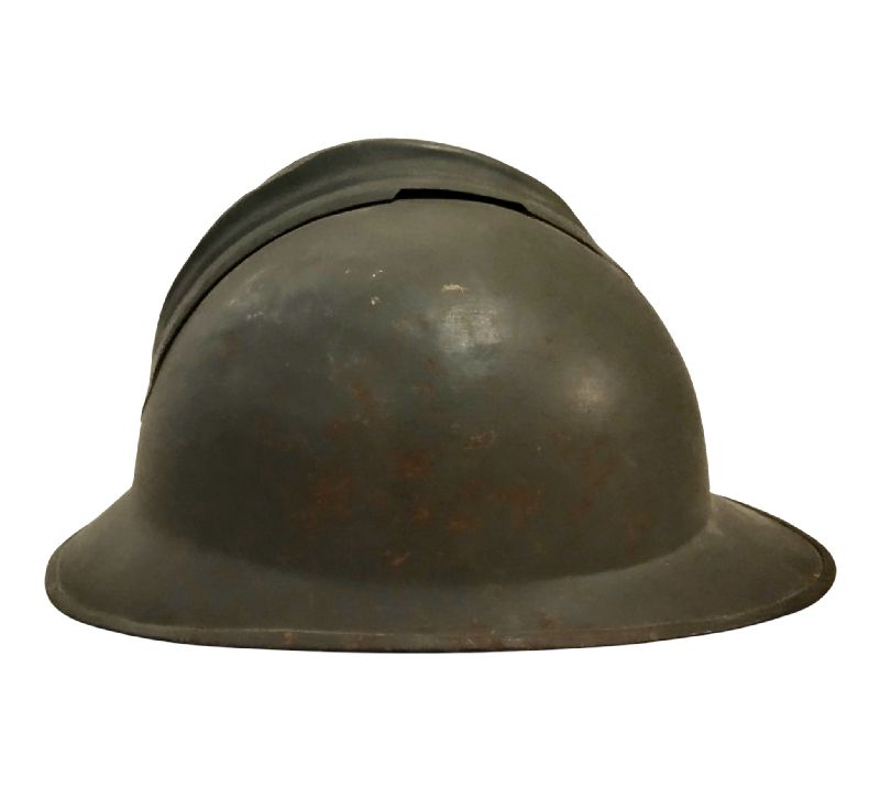 Elmetto tipo Adrian m.16, in uso fino al 1933, metallo dipinto verde con fregio frontale a vernice nera, interno in pelle naturale completo di soggolo; in buono stato.