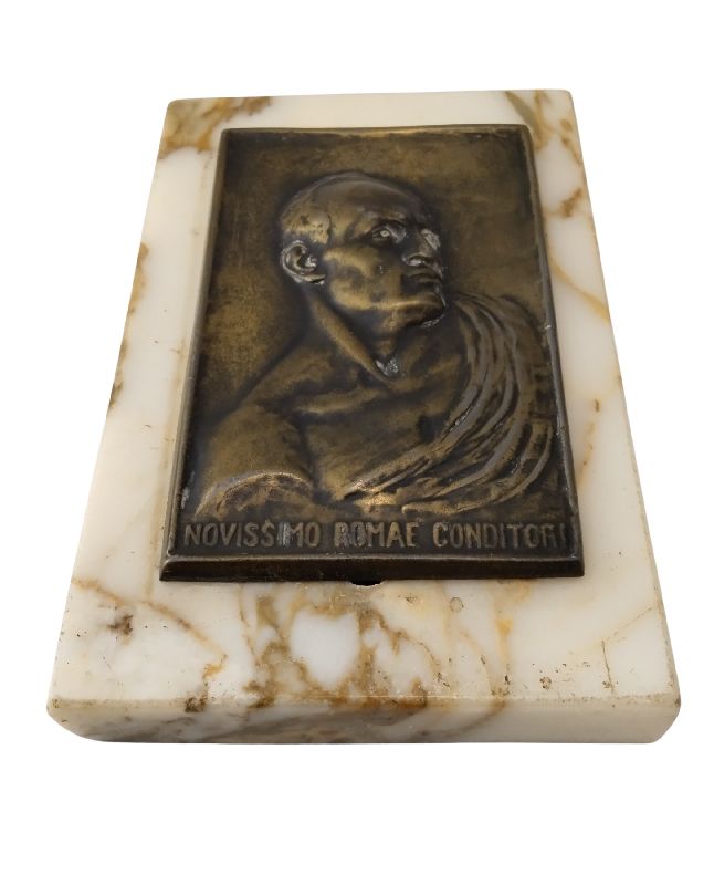 Piccolo fermacarte in marmo con applicata placchetta con effige del Duce giovane con tunica ad imitazione degli imperatori romani, in basso la dicitura " Novissimo Romae Conductor". In ottimo stato.