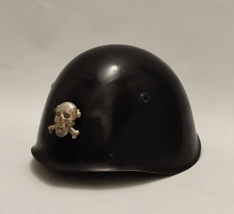 Rarissimo elmetto in acciaio m.33 dei Moschettieri del Duce, vernice nera lucida con leggere tracce di ossidazione con applicato, tramite doppia graffa con dischetti di latta zincata all'interno dell'elmo, bel teschio in argento punzonato. All'interno la vernice presenta ossidazioni diffuse e la cuffia, sagomata a dente di lupo, si presenta in buono stato, così come il soggolo, molto raro. L'elmo segue totalmente il regolamento dello speciale corpo dedicato alla guardia personale di Benito Mussolini; in buono stato.