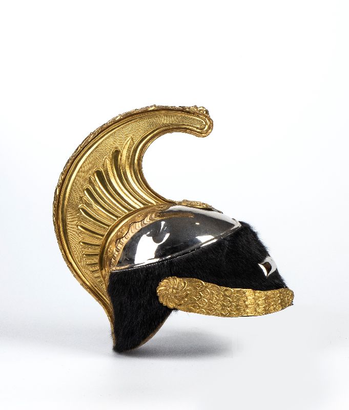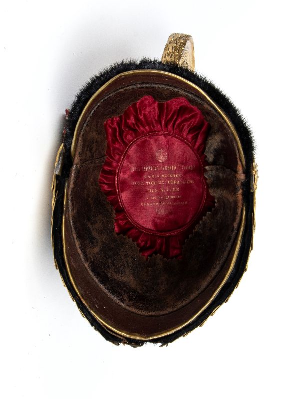 Elmo con coppo e croce frontale in metallo argentato, cimiero e soggoli dorati, corpo ricoperto di pelo, interno con cuffia di seta es alluda in pelle; in ottimo stato.