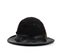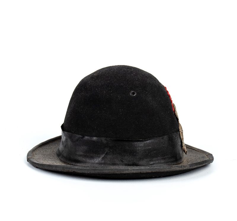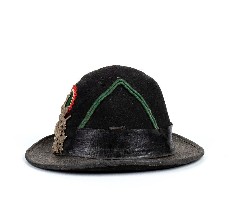 Feltro con tesa ricoperta di tela cerata, fregio frontale in metallo bianco, completa di nappina e penna, in buono stato.