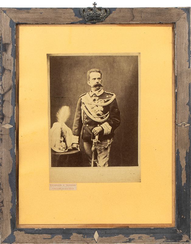 Fotografia di Re Umberto I in divisa da generale; firmata dal fotografo Weintraub; presenza di una dedica evanescente, non leggibile; in cornice coeva in argento ornata di corona reale, dono del sovrano.