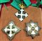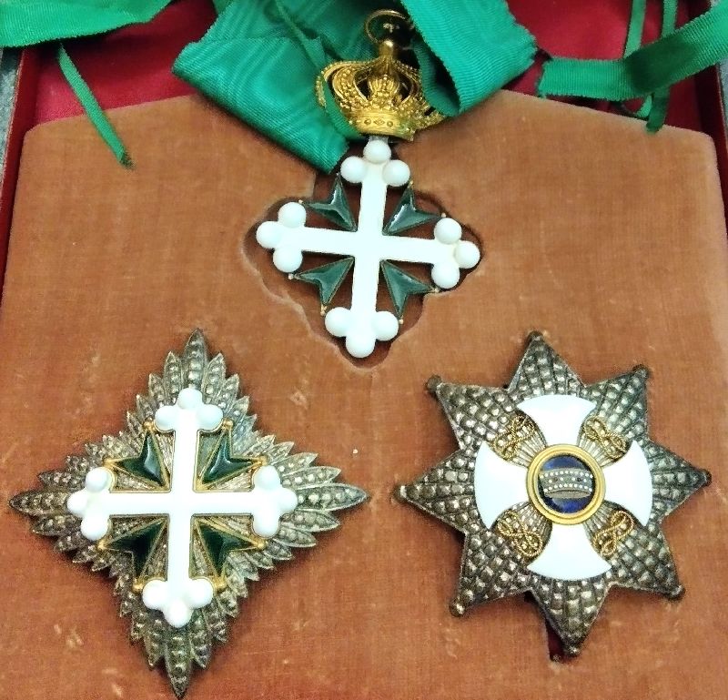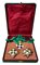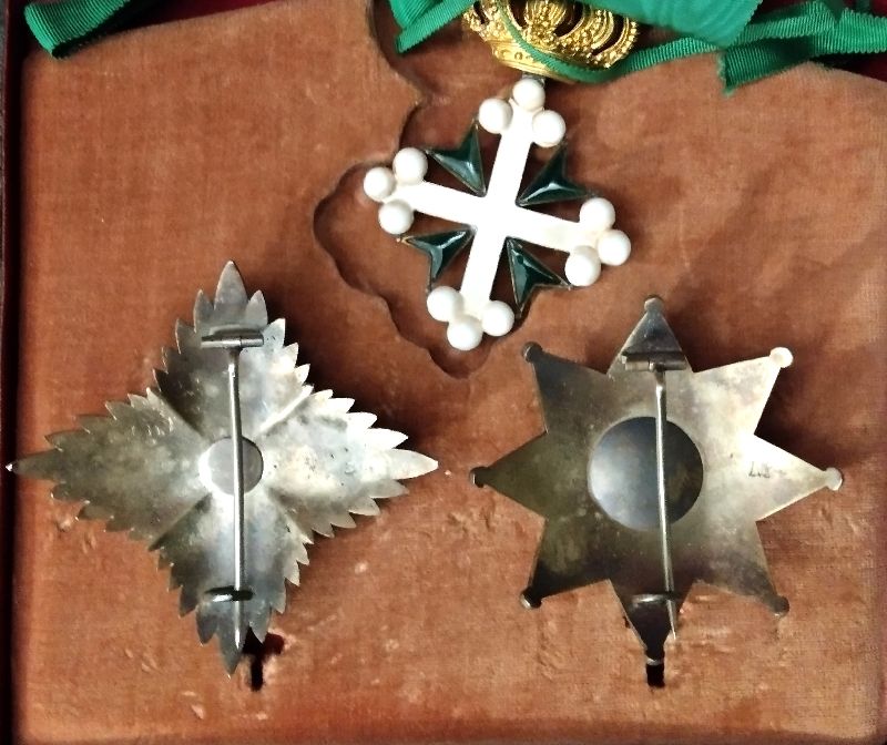 Astuccio contenente un set di Grand'Ufficiale dell'Ordine dei SS Maurizio e Lazzaro, composto da placca in metallo gettato con applicazioni in smalti e commenda e una placca da Grand'Ufficiale della Corona d'Italia in metallo gettato e applicazioni in smalto di bassa manifattura ma in ottimo stato, interessante.