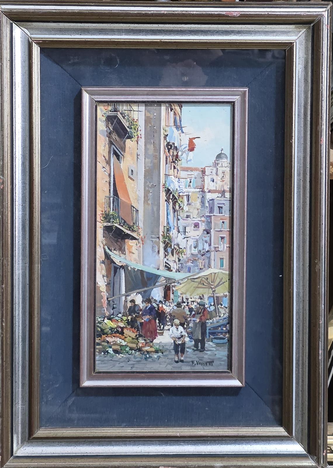 Francesco Vassetti (Napoli 1936-1920) Misure: cm.15 x 30 senza cornice Misure: cm.36 x 51 con cornice Olio su Pannello Firma in basso a sinistra F.Vassetti Titolo Via Porta Nolana,Napoli