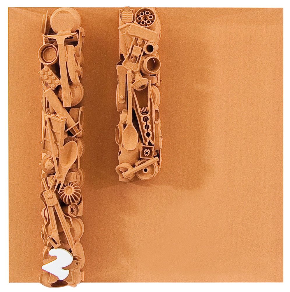 materiale plastico su tavola e colore acrilico cm. 40x40, titolo e firma al retro, dichiarazione d'autenticità dell'artista su foto, entro teca in plexiglass.