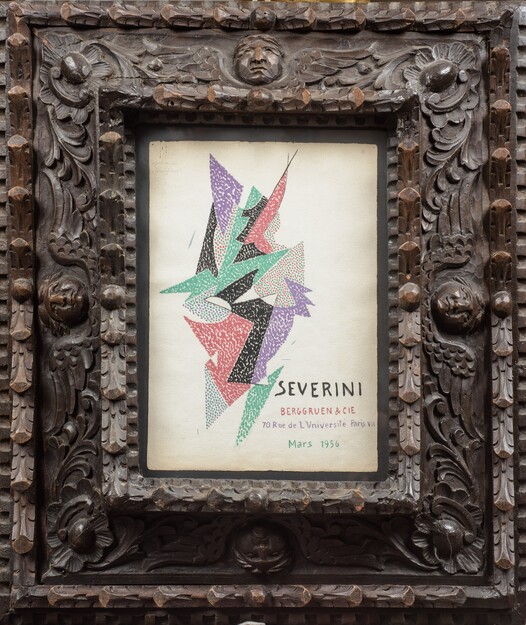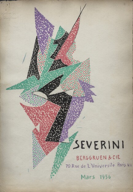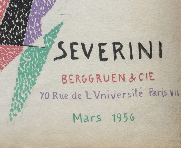 Opera recante scritte autografe in basso a destra "Severini Berggruen & Cie 70 Rue de l'Université, Paris Mars 1956" e in alto a sinistra "copertina per Cornegliano" (?).Si tratta di uno studio per il manifesto della mostra alla Galleria Berggruen di Parigi, spazio dedicato alle arti grafiche moderne, nel marzo del 1956.Opera con certificato di autenticità di Romana Severini Brunori, Roma 10 Luglio 1996. In cornice.